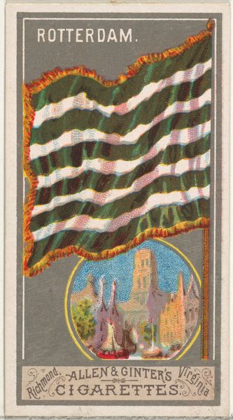 This small card titled "Bordeaux" is from the City Flags series by Allen & Ginter Cigarettes. The composition divides into two distinct registers, each framed by a decorative border. The upper portion depicts the flag of Bordeaux, with its heraldic imagery rendered in miniature. Notice the careful arrangement of colors and symbols—the lion, the castle, all precisely placed. Below, the architectural view presents a cathedral with its soaring spires, evoking a sense of civic pride. As a commodity, this card functioned within a network of signs, using cultural symbols to enhance brand appeal. This piece reflects how objects of art interact with commerce, employing flags and architecture to create a sense of place and identity. Consider how the formal elements here—the division of space, the use of symbols—work not just aesthetically but also as part of a much larger discourse about trade and representation.