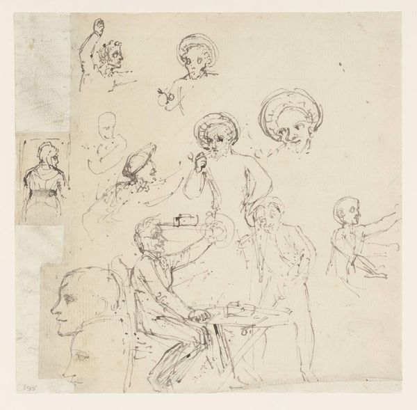 Curator: This pencil drawing presents us with multiple head studies by Jordanus Hoorn, dated sometime between 1763 and 1833. What are your first thoughts? Editor: There's a tentative quality here. A sense of practice, almost like visual note-taking, which I find refreshing. The artist experiments with the facial expressions and clothing, but nothing feels very solid or polished. Curator: Agreed, it gives an interesting look into Hoorn's artistic process. The accessibility of pencil and paper were pivotal for academic artists to develop a skill set through repetitive training. Consider the historical context: How did access to art academies, patronage, or social status dictate who could afford materials or time for such practice? Editor: Right. It's worth questioning whether this sheet represents academic exercise, or if Hoorn perhaps struggled to make a livelihood through portraiture. The relatively low cost and portability of pencil meant even a struggling artist could still explore his craft. Curator: Exactly. These heads are more than just representations; they point to the economic and social factors that shaped the art world. You know, it is also interesting to note that these could have also been practice studies for the printing and bookmaking industry at the time. Editor: I see what you mean. There are quite a few reproductions done around the late 1700s with very similar depictions. That industry required numerous people, like Hoorn here, to be versed in human anatomy and different reproduction methods. Curator: Indeed. By analyzing the medium itself – pencil on paper – and pondering the practical applications of such works, we unearth so much. These sketches give us not just likenesses, but echoes of a world where art intertwined with daily life and political dynamics. Editor: It makes you realize that an artwork doesn't always have to be 'finished' to be insightful. This collection of sketches, however rough, offers a peek into both the artistic skill-building of the era and the economy around reproductive work in that period.
