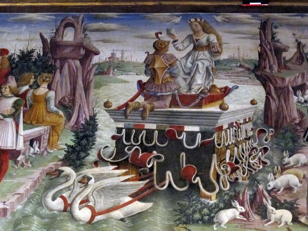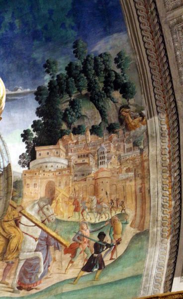 Antoniazzo Romano, around 1450, painted 'Stories of the Holy Cross', a captivating fresco. At first glance, you're met with a dynamic interplay of figures densely packed across the scene. The composition is structured around a stone bridge that creates a visual division, drawing our eyes to the altercation at its center. The artist's use of color is striking; vibrant reds and golds contrast with the muted tones of the landscape and armor, highlighting the characters and drawing attention to the narrative. But it's the formal structure that really grabs you. Romano plays with perspective, creating a flattened picture plane that pushes the figures forward, intensifying the drama. The bridge not only divides but also acts as a stage, emphasizing the performative nature of power and conflict within the context of religious narrative. The fresco challenges fixed meanings of heroism and authority, inviting viewers to question the values represented. It's a fascinating intersection of faith, power, and artistic expression.