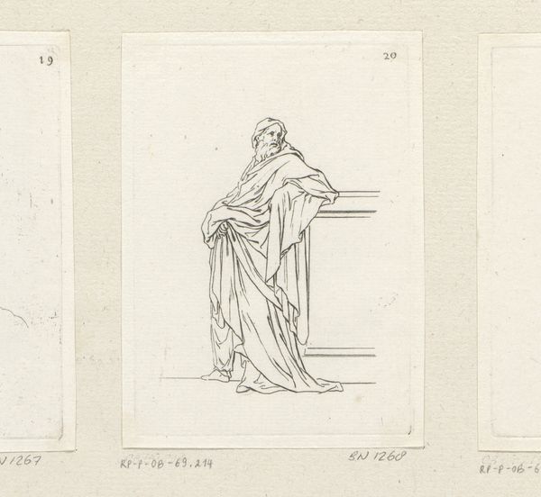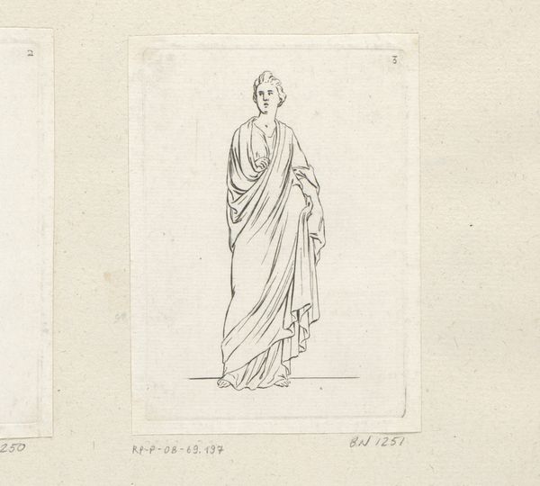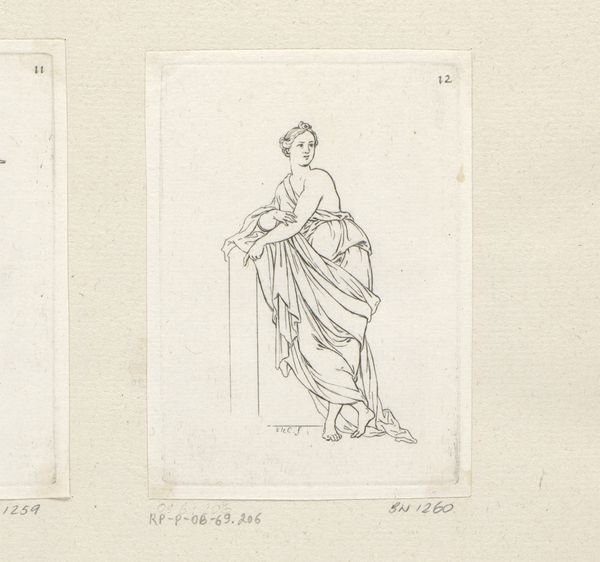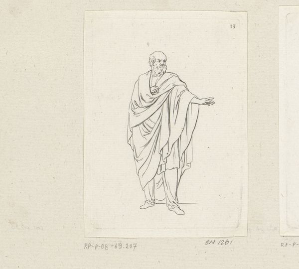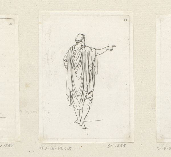 Editor: Here we have "Standing Woman with Right Arm Extended" by Sébastien Leclerc I, created in 1706 using pencil. It's quite austere. The lines are precise and there is an interesting use of draping. What is your interpretation? Curator: Looking at the materials—pencil on paper—and considering its production in 1706, it’s critical to think about this drawing not as a singular work, but within the context of artistic labor and production. It’s a study, isn't it? Meant for further development. How does that change your perception? Editor: That’s an interesting point. Seeing it as part of a process rather than the end goal makes me wonder about its utility and role in Leclerc's practice. I guess it highlights the unseen work in creating ‘high art.’ Curator: Precisely! The use of pencil, a relatively accessible material, points towards its function as a tool. It allows us to consider the economics of art production at the time: the preparatory work, the division of labor, and the eventual transformation into, perhaps, a more 'valuable' artwork through other mediums, like engraving. Who would buy this sketch, and for what purpose? Editor: I didn’t consider the economic aspects, that really adds another layer of appreciation! I always considered drawings as the final media itself, not only a step in producing an image. Curator: The materials invite such a perspective! By looking at the work this way, we begin to challenge the romantic idea of the solitary genius and engage with the broader material and social realities of artistic creation. Does this help shape a different relationship to the art? Editor: It certainly does. Thanks to Leclerc, I now see value in understanding materials to reveal labor, production and the entire social structure behind artworks!