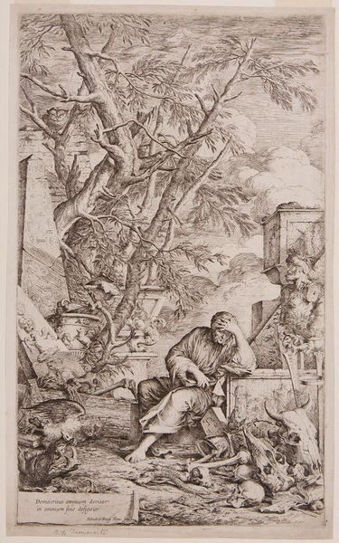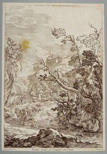 Curator: Jacobus Coelemans, born in 1654, created this pen and ink drawing, "Tobias and the Angel," now held at the Harvard Art Museums. Editor: It feels immediately intimate, almost like witnessing a private encounter. The delicate lines suggest a vulnerability, wouldn’t you agree? Curator: Absolutely. The subject matter is drawn from the Book of Tobit, where the angel Raphael accompanies young Tobias on a journey. It’s a narrative steeped in themes of healing, guidance, and divine intervention. Editor: Notice the prominence of the fish, its symbolism carries significant weight. In many traditions, the fish is a symbol of abundance, fertility, and spiritual transformation. Here, it connects to the healing of Tobias's father's blindness. Curator: The river scene itself acts as a location for symbolic cleansing. But from a modern perspective, the angel's intervention raises questions about agency, power dynamics, and how we frame the idea of assistance. Editor: It's amazing how a simple drawing can contain so many layers of interpretation. Thanks for guiding us through those complexities. Curator: My pleasure. It’s a reminder that art, even from centuries ago, can prompt us to rethink our present.
