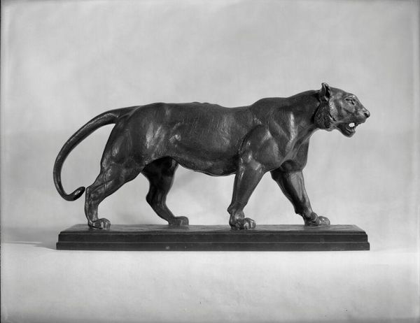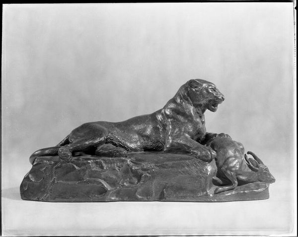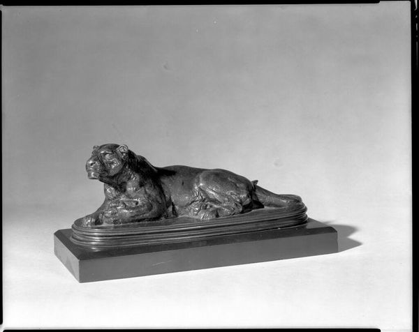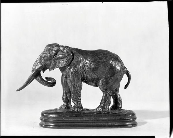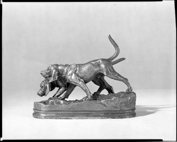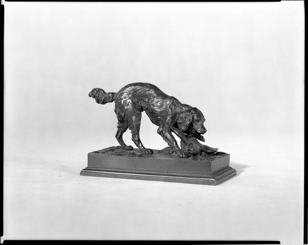 Curator: This is Antoine Louis Barye's small bronze, "Wolf Caught in a Trap," made sometime during his lifetime, 1795 to 1875. Editor: It's all tense muscle and howl. You can almost hear the animal’s pain echoing in the gallery, a visceral experience despite the miniature scale. Curator: Indeed. Barye masterfully captures the animal's torment through its contorted posture, emphasizing a raw emotional state. The trap itself is almost an afterthought in the composition. Editor: I'm struck by the way the light catches the wolf’s fur, making it seem almost alive, writhing even in stillness. I find it strangely beautiful, this depiction of agony. Curator: Barye's genius lies in his ability to ennoble the animal, transforming a scene of suffering into a compelling artistic statement. Editor: It’s a reminder of our own vulnerability, isn’t it? That we are all, in some way, caught. Curator: Perhaps. A potent piece, however you interpret its message.