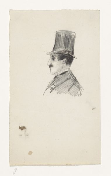 Anthonie Willem Hendrik Nolthenius de Man created this print, "Man met hoge hoed", around 1828. Nolthenius de Man lived through a tumultuous period in European history, witnessing the rise and fall of Napoleon and the subsequent reshaping of the continent. In this small but telling portrait, we see a man in profile, sharply dressed in the fashion of the day, most notably, the high top hat, a symbol of bourgeois status. During this period, dress and appearance were critical markers of identity and social standing. The fur collar around his neck suggests a certain level of affluence, protecting him from the cold, both literally and metaphorically shielding him from the harsh realities faced by those lower down the social hierarchy. This image raises questions about who is included and excluded in the narratives of power and representation. It invites us to consider the emotional detachment that can accompany privilege and how class distinctions shape individual experiences and perceptions.
