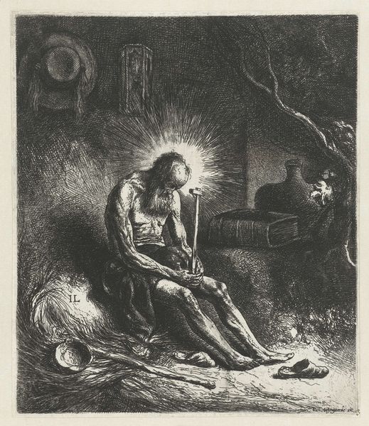 This is "Katerina Kisses Grushenka's Hand" by Fritz Eichenberg, an illustration rendered with delicate lines and a somber tonal range. The composition is divided diagonally, with the figures arranged on a plush sofa dominating the upper portion, creating an intimate, enclosed space. Eichenberg's manipulation of light and shadow is particularly striking. The soft, diffused light gently models the forms, creating a sense of depth and volume. The darker areas, particularly in the background, contribute to the overall mood of introspection and emotional intensity. The composition is carefully balanced, with the figures positioned in a way that draws the eye through the scene. This work employs a visual language that speaks to themes of human connection. Eichenberg's approach destabilizes conventional representations of power dynamics, instead emphasizing vulnerability and unexpected bonds. The image invites viewers to contemplate the complex emotional undercurrents of the scene.