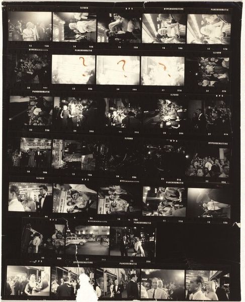 Curator: This gelatin silver print, made by Robert Frank around 1957 or 1958, is titled "New York Times" ideas no number. What strikes you initially about this work? Editor: The immediate effect is its fragmented nature, resembling filmstrips pieced together. There's a darkness, a sense of urban grit permeating the whole thing. Curator: Indeed. Frank was very intentional in his depiction of post-war America, and he often focused on the darker undercurrents. Here, the choice of a "New York Times" headline hints at a societal commentary—a reflection on ideas, but through a lens of fractured reality. Think about the power structures at play and what a title such as this is hoping to convey. Editor: And that fragmentary feel aligns with a kind of modern alienation. You see glimpses of different scenes - a city street, an interior with people dining – as if randomly stitched together. I’m immediately wondering how that physical creation process mirrored or challenged what he was seeing in those scenes. What was his darkroom process for arriving at this image? Curator: His working process mirrors the disjointed feeling of the image. Frank intentionally moved away from traditional notions of photographic perfection, embracing blur and unconventional compositions. The gelatin silver print underscores that material presence—that tangible object. Editor: I’m curious about the labor of taking all of the photos. Was it mass production intended for commercial goals, or a project with a finer hand that intentionally undermined consumption or mass-media? Curator: The selection of images—a seemingly mundane snapshot of dining, juxtaposed with cars and what appears to be gallery scene, all filtered through a dark filter, seems almost as a metaphor for art world elitism of the period. Editor: I see how Frank used these mass production photographs, but made deliberate choices in how they were shot and composed that were not straightforward. They don’t celebrate commercialism, they interrogate it through this arrangement and printing. It really complicates our relationship with the image and the objects/materials displayed in each picture. Curator: I completely agree. Frank’s art compels us to ask who has the power to curate narratives, and who gets left out of the frame. Editor: So while each fragment contains its own labor, when printed together, they show that the photograph, as a product and form of visual labor, still has a grip on us today. Curator: That's insightful. It encourages us to deconstruct dominant narratives. Editor: And that is how the photograph continues to endure, if not thrive today.