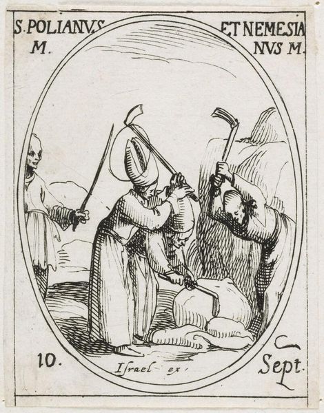 Editor: This is Jacques Callot's "Saint Sabbas," a small etching. The figure seems very self-contained, almost hidden within the landscape. What stands out to you? Curator: Note how the artist positions Saint Sabbas within the grotto. Caves are potent symbols of initiation and transformation. Consider what the wild animal might represent in this context. Editor: Perhaps the animal signifies the untamed aspects of human nature that Sabbas has mastered through spiritual discipline? Curator: Precisely. The symbolic language of the image creates a story, reflecting centuries of cultural understanding around sainthood and inner peace. Editor: I see now, it's not just a portrait, but a visual embodiment of spiritual concepts. Curator: Indeed. And it's through unpacking these symbols that we truly understand the artwork’s lasting impact.