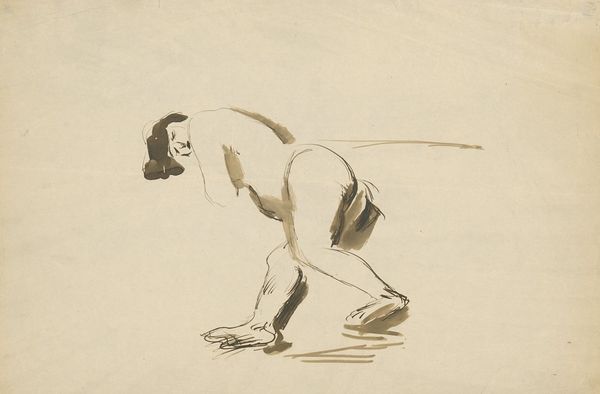 Editor: This is "Boy with a Bag on his Back" by Miep de Feijter, probably drawn between 1928 and 1941, a simple pen and ink drawing. He looks burdened, maybe tired. What kind of story do you think this image is telling? Curator: That slouch… Consider how the bag, this heavy weight, becomes a defining part of his identity. In many cultures, the act of carrying burdens, both literal and figurative, is linked to maturity, responsibility, even suffering. Does this image echo classical depictions of Atlas, burdened with the world on his shoulders? Editor: Interesting parallel! I see what you mean about identity and responsibility... but Atlas was a Titan. This is just a boy. Curator: True, but artistic imagery can transcend scale and circumstance. Consider also the ambiguity. What *is* in the bag? Treasure? Or merely life's detritus? What emotional associations do you have when considering a sack? Editor: Hmmm… childhood chores maybe? It’s true the image could represent so much. Curator: Precisely. And what about the boy's downward gaze? Does it signify introspection, shame, or perhaps just weariness? Think about how our understanding of the symbols of burden shifts with cultural context and personal experience. Do you see other objects in the sketch that are charged? Editor: I didn’t really notice at first but now you mention it... he's holding something small near his mouth. It could be food... a source of comfort, maybe? It gives another layer of meaning. Curator: Absolutely. Everyday objects depicted can reveal intricate stories if you look beyond the obvious! Editor: This sketch now speaks much more profoundly than it did initially. I will not overlook the mundane anymore! Curator: An open mind can bring everyday observations new dimensions.