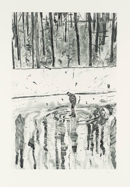 Okiie Hashimoto made this print, "Garden," and the thing that grabs me is how he's not trying to be fancy or realistic. He's diving right into the feel of a garden, using these bold, flat colors like yellow and red. It's the kind of simplicity that comes from really knowing your stuff, you know? Check out how he lays down the black ink for the trees. They're like these solid, strong lines that hold the whole image together. The texture in the ground and the sky, though, is where it gets interesting. It's almost like he's letting the materials do their own thing, creating these little imperfections and patterns. There's a single, delicate line drawing of a bird which stands in contrast to the strong black lines of the trees. It reminds me of some of Milton Avery's simpler landscapes, where it's all about getting the mood right, not every little detail. Art's this ongoing chat, right? It's about seeing what someone else did and then adding your own spin, without needing to explain every little thing. Hashimoto gets that, for sure.