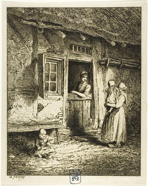 Curator: The etching before us, created by Adriaen van Ostade between 1647 and 1652, is entitled "Brillenverkoper en een oude vrouw," which translates to "The Spectacles Seller and an Old Woman." It's currently held here at the Rijksmuseum. Editor: My initial feeling is of peering into a hushed, secretive transaction. There's a curious mix of dimness and intense activity; like light filtering into a room full of unspoken needs. Curator: Indeed. The composition is structured through light and shadow, with a central, brightly lit figure contrasting sharply with the darker background. Ostade masterfully employs hatching and cross-hatching to suggest textures. Editor: The old woman, perched in that doorway...almost as if she's a bird in a nest. There's such wonderful weariness etched into her face – every line speaks of a long life seen in blurry focus until this peddler arrived. What do you suppose Ostade wanted to communicate here? Curator: Perhaps a comment on the commerce of daily life, a brief interaction highlighted against the mundane. The spectacle seller's wares are, literally and metaphorically, tools for improving understanding, or at least improving sight. It's worth remembering that genre paintings of this sort were fashionable at this period, capturing fleeting glimpses of ordinary life for the entertainment of middle-class people. Editor: It makes you think, doesn’t it? I mean, she's handing over what? Some meagre coins earned with such effort, for a bit of clarity. Does she see herself clearer after all these years? It makes me reflect on vision as metaphor for seeing truths, hard earned as life shifts shapes... I see her squint into time like my own aging. Curator: Ostade provides these narratives using form itself; the lines create the characters' aged and rugged appearance, their poverty suggested rather than overtly stated, thus providing social context but without being heavy handed. Editor: There is a kind of dignity that the picture exudes in such understated way that captures my attention. All three human elements create an entire drama. To make all three work, it could well capture everyday Dutch life. Curator: Exactly. Ostade’s close study, attention to lighting, and ability to use graphic techniques elevate the commonplace into something meaningful. This artwork gives such insight to our life in relation with the rest of us, as it provides with such careful lines how we relate in so fleetingly simple terms. Editor: In that light I feel as the spectacles might sharpen not only physical vision, but our own awareness in seeing each other as humans. What has been exposed in all our dialogue offers light on how we receive this, and offer perspective to the museum visitor as well.