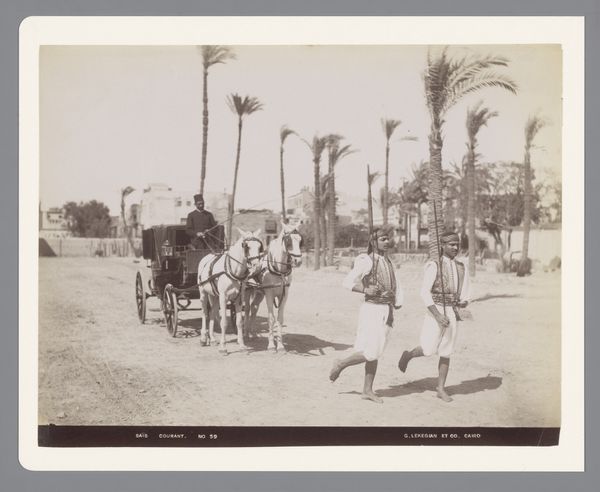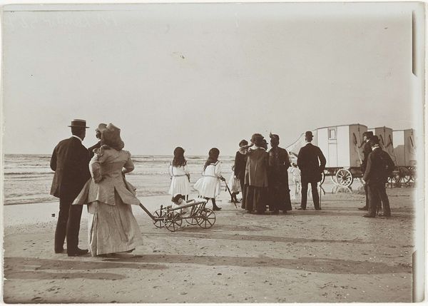 Curator: Here we have Robert Frank’s 1952 photograph, "Wedding, Spain." It's a black and white print that presents a bird's-eye view of a wedding celebration unfolding on a dusty plaza. Editor: It feels somber, despite the occasion. The grey tones emphasize the harsh, almost desolate environment. What strikes me is the visual hierarchy–or lack thereof. Everyone seems equidistant, without a clear focal point besides the collective mass. Curator: Precisely. This challenges the traditional symbolism often associated with weddings. Rather than emphasizing the individual union of two people, Frank seems to capture a moment deeply embedded within its social context. Consider post-war Spain and the prevalence of Francoist weddings… these were highly symbolic acts, public affirmations of national identity. Editor: Yes, and weddings have long been performative. The photograph’s elevated perspective lends an anthropological lens. Look at the horse-drawn carriages–symbols of tradition and perhaps social class–positioned almost theatrically. Curator: The choice of a bird's-eye view serves to level the playing field. Everyone is observed from a position of authority, potentially revealing power dynamics that underpin the ceremony. There is also a man on the bicycle at the top left that I find incredibly intriguing and maybe ironic because he appears freer. Editor: The bike certainly hints at an alternative narrative, but doesn't that only reinforce the weight of the traditions represented? Consider how horses, since antiquity, signify strength, nobility, and the sanctioned path… Even their pairing denotes balance, stability... while that single figure departs from them all. Curator: So, this is less a celebration of love, and more a visual statement on tradition, class and conformity in a specific cultural context. One could delve further into how such prescribed gender roles are manifest through such gatherings. Editor: It is a stark reminder that rituals, even joyous ones, carry weighty histories and societal expectations. These celebrations of unity simultaneously reflect potential constraints and limitations. Curator: It's this awareness that Robert Frank brought to his photography—observing, questioning, and documenting social realities without idealization. Editor: Leaving us with a photograph that lingers long after we’ve moved on.