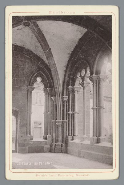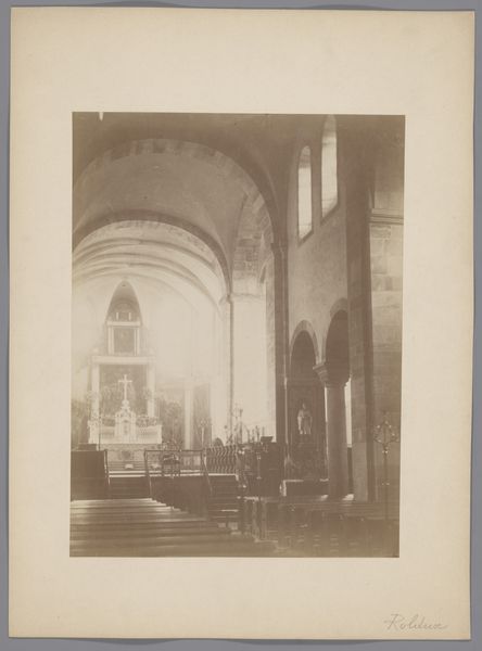 This photograph, titled "Interieur van de Abdijkerk Rolduc" and captured by an anonymous photographer from Monumentenzorg, presents a study in architectural form and the play of light within a sacred space. The image, rendered in tones of sepia, focuses on the interior of the Rolduc Abbey Church. The composition is structured around the massive stone pillars that rise towards arched windows, creating a sense of verticality and enclosure. Light streams in, carving out areas of stark contrast and highlighting the rough texture of the stone. The use of light and shadow not only defines the physical space but also evokes a contemplative mood. The photograph’s formal qualities invite an interpretation through the lens of structuralism, where the architectural elements function as signs within a larger cultural code of religious space. The solidity of the pillars contrasts with the ethereal quality of the light, creating a visual tension that destabilizes a fixed reading, thereby prompting viewers to actively engage with the image’s aesthetic and historical context.