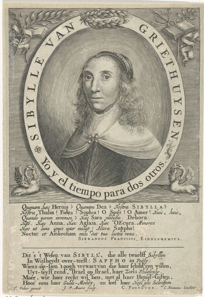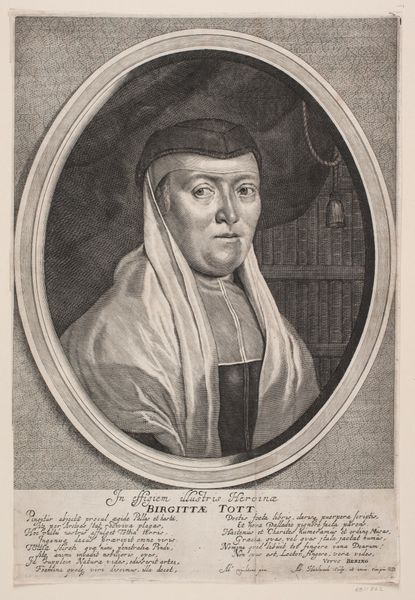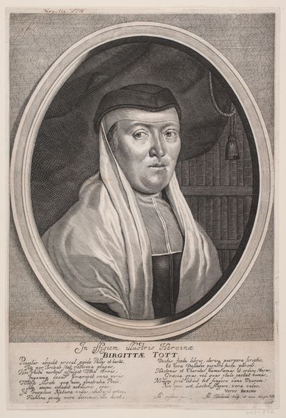 This is Pieter van Schuppen's portrait of Margaretha van Lotharingen, etched in the mid-17th century. The work presents the sitter encased in an oval frame. The somber hues and stark contrast create a contemplative mood. Van Schuppen employs line and form to explore themes of mortality and religious devotion. Margaretha gently holds a skull, a memento mori, which is sharply rendered. The smooth curvature of the skull contrasts with the angular folds of her habit, reflecting her monastic life. The artist also subtly uses linear perspective, drawing the eye towards the subject’s face and conveying a sense of depth, while the column behind her hints at the architectural structures of power and faith. The formal balance of the composition—the skull on one side and the column on the other—highlights the intersection of earthly existence and spiritual transcendence. Ultimately, the artwork’s power lies in its ability to use visual structure to meditate on the transient nature of life.