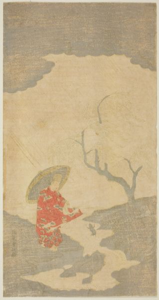 Curator: Suzuki Harunobu's "Chinese Poet," created around 1761-1765, presents a serene contemplation. Editor: The mood is quite somber, actually. I find myself drawn to the delicate color palette. Curator: It's a woodblock print, part of the ukiyo-e tradition, portraying an ambiguous figure overlooking what might be an abstracted Chinese landscape. But who is this figure? Is this romanticizing the other? Editor: Focusing on process, what strikes me is how Harunobu manages to create depth with the flat planes inherent to woodblock printing. The varying translucency must involve many carefully aligned blocks to yield subtle tones. Curator: Absolutely. Considering Japan’s history of artistic and philosophical engagement with Chinese culture, it is possible that Harunobu's portrayal seeks to reflect on both Chinese identity and a distinctly Japanese mode of idealization. Editor: Note also how the figure's robes dominate the lower section of the piece, the materiality amplified via the strategic distribution of white—could these bright areas be a conscious reference to imported Chinese silk? Curator: Yes, the composition places us firmly within the cultural gaze, where the material aspects speak volumes. Consider the access to such resources, the visual markers denoting class, position. It reflects back on societal hierarchies. Editor: True, while the poet contemplates a view that merges into indistinct representation, those lower planes feel like constructed markers, almost fabricated commodities that would appeal to their intended upper-class consumers. Curator: It asks, doesn't it? How does art reflect power? It seems Harunobu used that framework with delicate strokes in a profound exploration. Editor: A fascinating study in layered visual strategies, revealing aspects of both the depicted subject and the consumption patterns inherent to printmaking of that era.