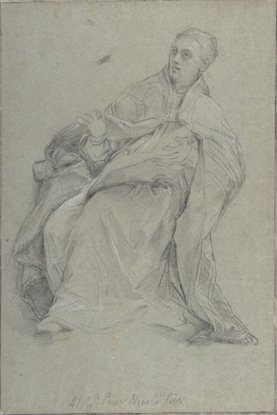 Editor: Here we have Isidore Pils’ “Study for Clovis,” made sometime between 1820 and 1875. It’s a charcoal and pencil drawing. The draped figure, rendered in shades of grey, looks intensely solemn. What's your take on it? Curator: Well, focusing on the materials themselves, notice how the charcoal and pencil—relatively inexpensive and readily available—were used in the service of creating something meant to adorn a chapel. This immediately raises questions about accessibility, class, and the means by which even religious institutions relied on the labor and material resources of everyday society. Editor: So, you're thinking about the kind of access people would have had to these materials? Curator: Precisely. The availability of charcoal and pencil allowed for a broader participation in art making, but here it's harnessed for a project commissioned by the Church. Also, the 'Study' aspect highlights the production process, stripping away some of the mystique surrounding "high art." Were these studies done by Pils himself, or were there assistants involved in the labor of preparation? Editor: That makes me think about how much preparation goes into creating larger pieces. The labor behind even seemingly effortless art. Curator: Exactly. And who benefits from that labor? Whose stories are told, and whose are left out of the narrative of production and consumption surrounding the art? Consider the availability of art education. Who had access to learn the skill to draw and make these studies? This drawing might present the viewer with an idealized image, but a Materialist lens compels us to examine the often-unequal social conditions underlying its creation. Editor: That definitely gives me a different way of looking at this. It is not just about what the artist created, but *how* they made it and who enabled it. Curator: Precisely! It is essential to keep asking about production. That’s why I value this viewpoint; it makes sure that even art made for the church makes us reflect on secular values of labour and materials.