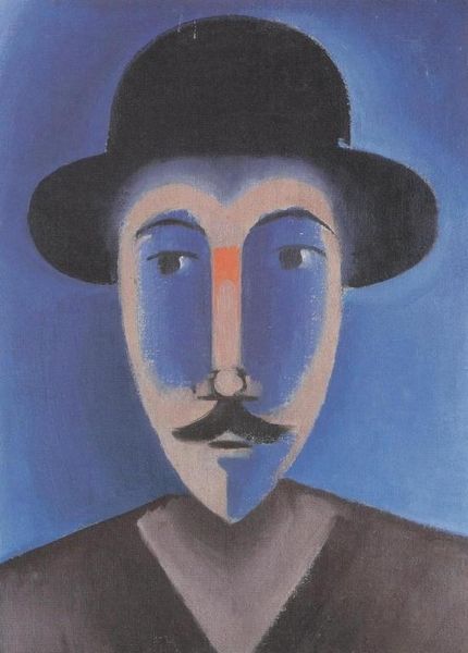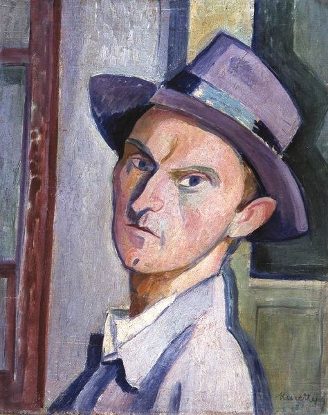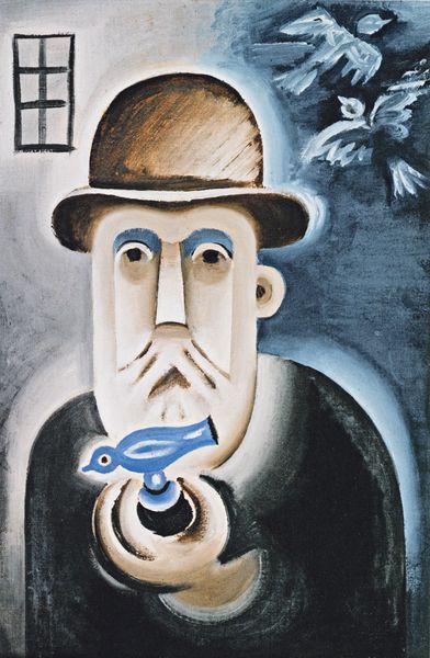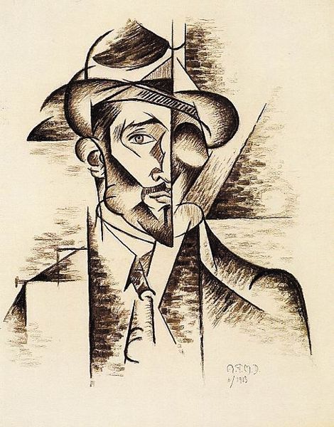 Curator: This is Jean Helion’s "Untitled" self-portrait from 1943, rendered in oil paint. It's an interesting exploration of identity through a Cubist lens, don't you think? Editor: My first impression? Melancholy. There's a sense of isolation radiating from that sharply geometric face. The limited palette only amplifies that. Curator: Yes, there’s something almost haunting about it, despite its simplified forms. The Cubist style dissects his face into planes, almost as if trying to understand the sum of its parts. It's a departure from traditional portraiture, certainly. The year it was created also makes it a time document, capturing a likeness during times of crisis, since Helion escaped a German prison camp that year. Editor: And how the light falls—or doesn't—it's so deliberate. The stark contrast highlights those planes you mentioned, almost sculpting the face. Those heavy outlines accentuate the features without really softening them. Like a mask more than a window to a soul. Curator: A mask perhaps born of trauma, a means to shield oneself. Those unblinking eyes, stark against the shadowy depths of the canvas… It’s a far cry from, say, the idealized portraits we might see of prominent figures of the time. Helion turns introspection into observation of how fractured the self can be. It really pushes you to confront a new standard. Editor: Absolutely. The formal structure—the strong verticals and angles of the hat, tie, and lapel juxtaposed with the flatter planes of the face—it’s all so precise, yet… vulnerable, I think? Is it intentional discord? Are we seeing him in conflict with himself? Curator: I think you've hit on something profound. Maybe it shows how art really reflects what's happening in a mind beyond replicating looks. The very act of breaking apart and reassembling the figure on canvas—what better representation of human strength in chaos? It makes one wonder if all self-portraits become unintentional landscapes of the soul. Editor: Exactly, and that, perhaps, is the genius of Helion's Cubist vision. An offering of a shattered image hoping that something brighter can come from the scattered pieces. It’s that little pop of red from the tie that keeps the darkness at bay for me. A symbol of what maybe Helion had to offer.