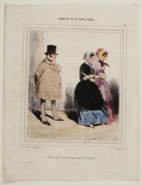 Curator: Here we have Paul Gavarni's lithograph, "It's my stevedore!" Gavarni, born in 1804, was known for his satirical commentary on Parisian life. Editor: The linear precision is quite striking; the cross-hatching and contrasting white space give it an almost architectural feel. Curator: Note how Gavarni uses costume here. The woman, cloaked, conceals herself, a visual metaphor for the limited roles afforded to women. Editor: I see a rather pointed critique of bourgeois courtship rituals. She is essentially objectifying the man, claiming ownership of him as if he were mere property. Curator: Indeed. The title itself underscores this dynamic, reducing the man to a mere "stevedore," a laborer. This inverts traditional gender roles, offering a sharp commentary. Editor: Ultimately, it's a beautifully rendered glimpse into the complex negotiations of identity and power during Gavarni's time. Curator: Yes, the artist's technical skill and social observations converge to create a work that still resonates today.
