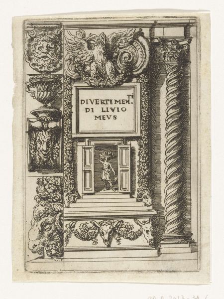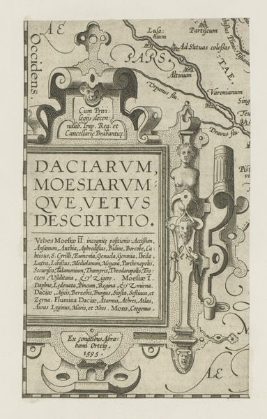Curator: Here we have "Hoekcartouche met halve fruitmand," or Corner Cartouche with Half Fruit Basket. It’s an engraving from around 1587 to 1590, dating it firmly to the Renaissance, although some might even consider it early Baroque. The artist remains anonymous. Editor: It feels decidedly *un*fruitful, doesn’t it? I mean, all that heavy ornamentation surrounding a dense block of Latin text… it's oppressive! Curator: Oppressive perhaps, but undeniably Mannerist in its decorative excess. That tension between form and function is absolutely key. We’re not looking at something meant to be *used*, exactly. It’s meant to impress, to convey status. Look at that fantastical creature on the lower left corner. Editor: A grotesquery for sure! But to *whose* benefit does it all redound? Look at that text! That must be a dedication... to someone named Iacobo Monavio Silesio Patricio Vratislaviensi. Likely a person of status, given all the honorifics. Silesia connects him with Poland. Curator: Right, but the engraving itself serves as a "monument of mutual friendship" by Abraham Ortelius, presumably the dedicatee. It's all about networks, connections, and, let’s face it, male bonding. A celebration of erudition in very ornate form. Editor: The patriarchal dimensions can’t be ignored. Inscribing friendships of scholarly men seems a calculated declaration to preserve the power of their names for posterity. Note how only his first name, "Abrahamvs," is referenced, and "Ortelivs" sounds very Latinised for the purpose of formal introduction. Curator: So, a celebration of power, yes, but one framed by humanism, of Renaissance friendship, even within constraints of masculine culture. See how the fruits erupt in the form of ornamentation around the corner? It gives the engraving life! Editor: And yet, I find myself wanting to liberate this small portion from its original context! It feels trapped, somehow. Its dense symmetry does, however, offer an aesthetic perspective that transcends cultural biases and temporal strictures. Curator: I see it differently! As a fragment of its original setting it presents a tantalising narrative on human relations.