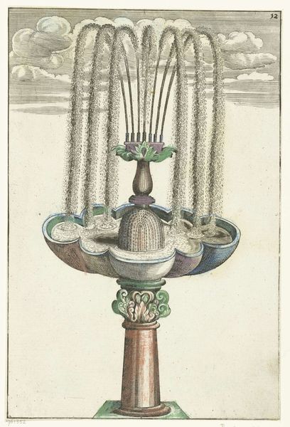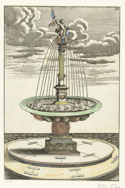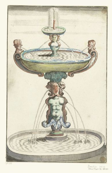 Editor: This is “Bassin met vier lobben,” or Basin with Four Lobes, an engraving from 1664 by an anonymous artist. I’m struck by its almost cartoonish rendering, despite the fact that it’s an image of something intended to be grand and stately, like a fountain. What do you make of it? Curator: The "cartoonish" quality you perceive isn't necessarily unintentional. Prints like these served a crucial role in disseminating architectural ideas during the Baroque period. While some aimed for precise realism, others, particularly pattern books and design proposals, often employed a stylized, almost exaggerated visual language. This was partly due to the limitations of the medium—engraving—but also to emphasize certain design elements and create visually appealing images that would inspire patrons and artisans. Editor: So, the visual exaggeration might have been a selling point? Curator: Exactly! Consider the intended audience. Who would have been commissioning fountains? Primarily the wealthy elite, civic leaders, and religious institutions. Images like this offered them a vision of potential grandeur and an accessible way to communicate their desires to the craftsmen involved. The strong lines, the simplified forms – they were not just artistic choices but also functional tools for conveying information about structure and decoration. How do you think a print like this may affect access to luxury items in a broader sense? Editor: I guess it allows more people to understand what they could potentially purchase or commission even if they couldn't travel widely. That seems empowering for consumers. Curator: Precisely! Prints like these played a vital, though often overlooked, role in shaping visual culture and driving consumerism. It prompts one to question how seemingly simple images participate in wider networks of power and influence. Editor: It’s amazing to think about an image of a fountain as having its own socio-political weight. I’ll definitely look at prints differently from now on!