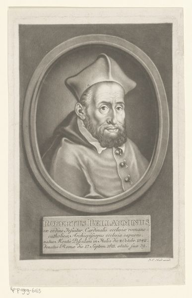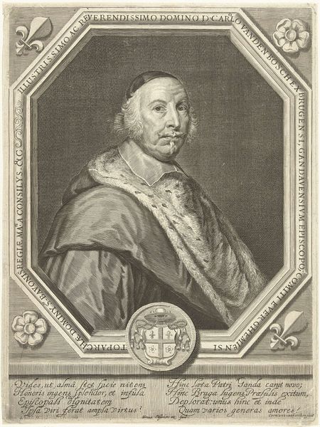 Richard Collin created this print of Macarius Simeomo, Abbot of Antwerp, likely sometime in the mid-to-late 17th century. The image speaks to the power and authority of religious figures in the Southern Netherlands during this era. Consider the visual language employed: Simeomo is depicted in formal attire, complete with a mitre and ornate robes. The portrait is framed by an elaborate oval border, further enhancing his status. Below, we see a heraldic crest, a common symbol of lineage and power in aristocratic and ecclesiastical circles. This imagery constructs a sense of reverence and respect, reinforcing the Abbot's position within the social hierarchy. Looking at institutional history we know that the Abbey of St. Michael in Antwerp played a significant role in the region's religious and political life. Prints like these served not only as portraits but also as tools for projecting power and maintaining social order. To fully understand this image, we might consult archival records, religious treatises, and social histories of the period. These resources could reveal the complex interplay between art, religion, and power in 17th-century Antwerp.