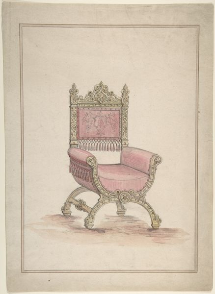 Editor: This drawing, titled "Design for an Empire Chair," comes to us from somewhere between 1775 and 1825. The materials are listed as print and colored pencil. It strikes me as quite elegant, almost theatrical, in its presentation. What symbols and imagery jump out at you? Curator: The chair itself speaks volumes. Note its curved lines, inspired by classical Greek forms, but ornamented to showcase luxury and power. This wasn't mere seating; it was a throne in miniature. How do those details affect your impression of it? Editor: Well, the tassels and gilded details, for example, make it seem less functional and more like a status symbol. Almost performative in a way, given the theatrical comparison I had made. Curator: Precisely. Think about the era – the rise and fall of empires, the longing for a romanticized past, yet grounded in the needs of modernity. Every element, from the sphinx-like ornament to the laurel wreath, tells a story of cultural ambition and references that tie the present back to a powerful symbolic lineage. The symbolism suggests a deliberate crafting of an image for an emerging empire. Editor: It’s like a carefully constructed piece of propaganda through furniture design! Were people aware of these symbols at the time? Curator: Absolutely. This Neoclassical style permeated all aspects of life, reminding viewers of an idealized history. The symbols served to legitimise power, creating a tangible link to a glorious past and imbuing the present with the weight of that history. Editor: So much information embedded in what seems like a simple chair design. Now I see how seemingly decorative elements can speak volumes about the cultural mindset of an era. Curator: Indeed. What we observe isn't just furniture; it's a cultural statement preserved in material form, carrying the aspirations and memories of its time.