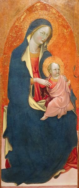 Editor: Geertgen tot Sint Jans’ oil painting, “The Glorification of the Virgin,” made around 1480, immediately strikes me as… well, heavenly, but also a bit eerie. It feels like looking into a dream. There’s Mary and the Christ child, but also a hazy crowd of figures surrounding them. What’s your take on it? Curator: Ah, yes! Eerie and heavenly are quite apt! I like to imagine Geertgen, lost in thought, perhaps after a late-night candlelit vigil, trying to capture the ineffable. The Virgin and Child are the focal point, almost floating on a crescent moon. But look closer—that's a dragon she's standing on! Can you see the instruments? Each signifies earthly pleasures relinquished in this divine scene. Editor: Yes, I see the musical instruments now, scattered almost carelessly around the edge! They seem deliberately discarded, which amplifies that feeling of leaving the earthly behind. Is that what the figures surrounding Mary represent, then? The earthly world? Curator: Partly. They are souls, some emerging from purgatory. Geertgen brilliantly contrasts Mary’s serene, illuminated presence with the shadowy figures yearning for salvation. The light emanating from Mary isn't just visual; it's a beacon of hope! The Renaissance was a time when faith and humanism intertwined – this piece feels like a perfect representation of that intersection. Editor: It's fascinating how those contrasting elements create such a unique atmosphere. I hadn't really considered the purgatory aspect, but that adds a whole new dimension to the work. Thanks, that makes so much more sense now. Curator: My pleasure! Art like this makes you feel, doesn’t it? It lingers, asking you questions long after you've turned away.