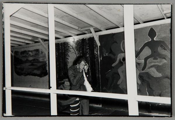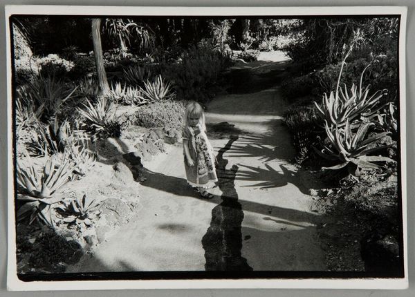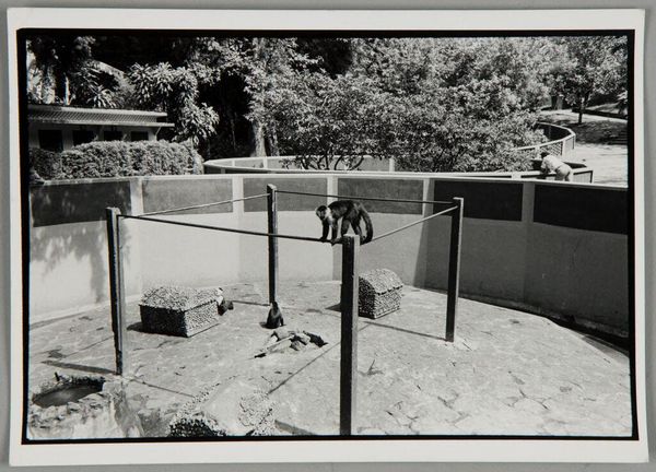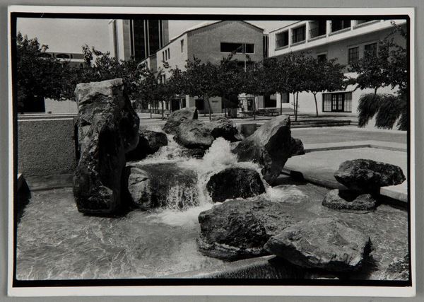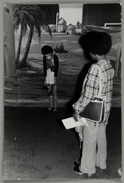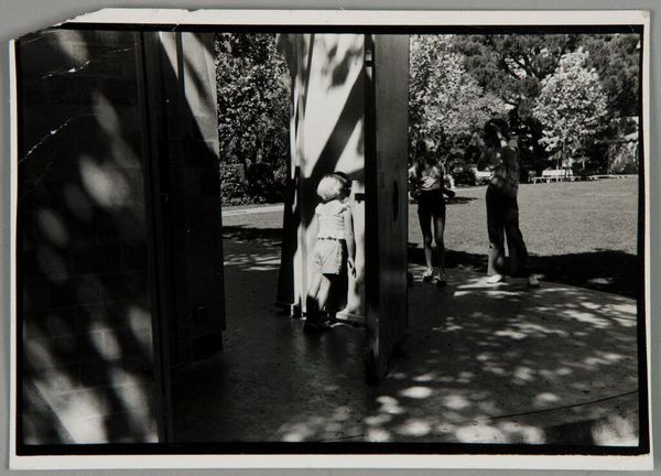 Editor: This is an untitled black and white photograph by Bill Dane, taken in Tahoe. It shows a family at what seems to be a miniature golf course with a replica of Stonehenge. What strikes me is the contrast between the ancient monument imitation and the everyday family activity. What do you see in this piece? Curator: The simulacrum of Stonehenge functions as a cultural marker, doesn't it? It speaks to our inherent desire to replicate and monumentalize. Perhaps it's the artist’s comment on how we repurpose symbols, stripping them of their original sacred meaning. What do you make of the family’s presence within this landscape? Editor: I guess they're just living their lives, unaware of the deeper implications. It's interesting to think about how these symbols become part of our collective unconscious. Curator: Indeed. Dane invites us to consider the layers of meaning embedded within our ordinary experiences, and to question how we inherit and transform cultural symbols.