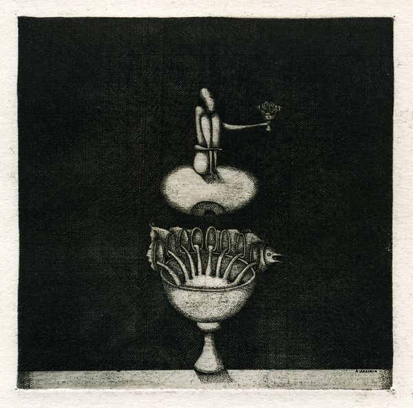 Oleksandr Aksinin made this surreal print called ‘Coffee Beans’ without dating it, so we don’t know exactly when. The composition is a wild perspective game and I love the limited palette of blacks, whites, and grays. It makes me think of printmaking as a kind of alchemy. Look at the repeating curved lines, the rows of spoons, the lace-like textures on the sides – everything is carefully considered, yet retains a playful quality. My eye keeps going to the cup near the top with floating circles above it. It’s a small detail, but it feels like the key to the whole piece, suggesting a dreamlike transformation. Aksinin’s way of blending precise detail with a sense of the absurd reminds me a little bit of Magritte, but with a darker, more personal twist. Ultimately, this piece is a reminder that art doesn’t need to be loud or colorful to be deeply engaging; it just needs to spark our imagination.