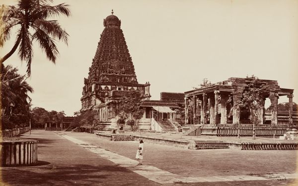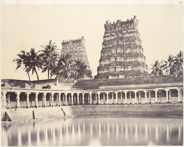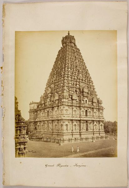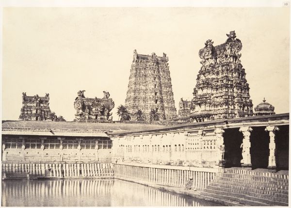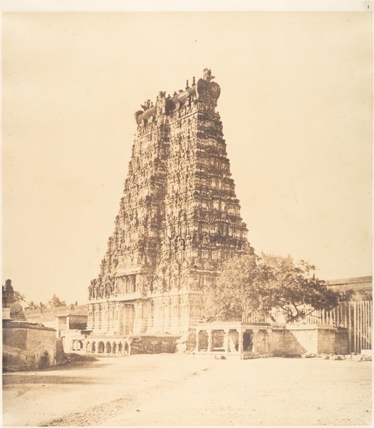 Curator: Looking at this photograph, the towering structure immediately commands attention. Editor: It certainly does. There’s an almost overwhelming density to the forms – it feels both ancient and somehow bustling with life even in this still image. Curator: This is a gelatin silver print from 1878 by Nicholas & Co., titled "Entrance gate and Gopuram of the Meenakshi temple at Madurai, Tamil Nadu, India." It showcases one of the entrance gates, leading to the celebrated Meenakshi Temple. Editor: The temple looms large. It also gives me pause to consider this colonial-era image through an Orientalist lens, recognizing how photography at the time contributed to Western perceptions of other cultures, specifically in a way that framed the people more than celebrating the artwork. What kind of statement was this image trying to convey, during its time? Curator: You’re right. Considering its symbolic density, the architectural vocabulary speaks to millennia of continuous tradition and belief, especially the sacred gopurams. This isn't a vacant monument; rather it suggests living devotion, embodied in the stories that proliferate these carved figures, gods, goddesses, and celestial beings. Editor: The geometric organization too: the ordered ascension. Yet, I find myself reflecting on the figures at the base, rendered secondary, or incidental even; subjects reduced to the backdrop of this architectural behemoth, so that Westerners at that time, could frame and exoticize, consuming the place, erasing those actually from there. Curator: Indeed. What does that visual hierarchy suggest about cultural exchange, understanding, and perhaps, misunderstanding? However, isn't the temple's function to elevate something—spiritual values, sacred narratives beyond our immediate world—above the everyday? It's a space meant to instill awe, connecting people to forces beyond their immediate understanding. Editor: Yes, that could also very well be it, that within those spiritual convictions is the sense of elevation toward sacred ground, perhaps this photograph truly can convey that idea—though it's crucial we engage critically with the complexities inherent in its creation and reception. Curator: Absolutely, reflecting upon not just its intrinsic forms and narrative echoes, but how history and power play roles even in documentation, allows for richer layers of understanding to manifest. Editor: I agree. By confronting these entangled layers, we allow for conversations, expanding art history with cultural identity, in turn hopefully, reaching understanding across diverse audiences.