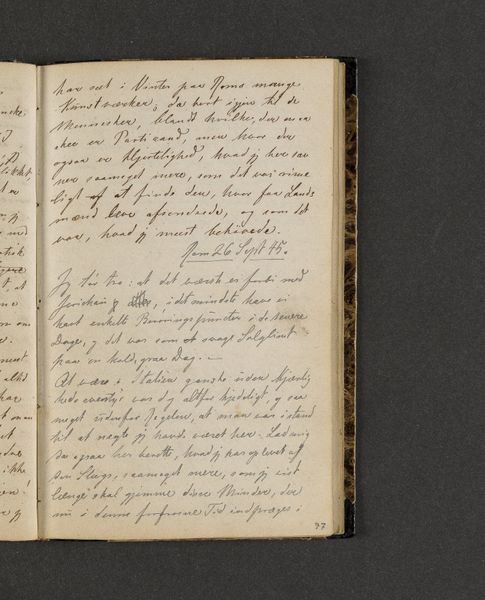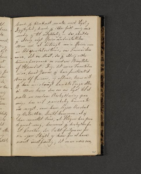 Editor: Here we have Johan Thomas Lundbye's "Rejsedagbog" or "Travel Journal" from 1845. It’s a drawing on paper and textile. The script gives it a very intimate feel, almost like eavesdropping on personal thoughts. What strikes you about this piece? Curator: What grabs me immediately is the raw materiality. Look at the weave of the textile binding, the fibers of the paper itself, even the way the ink bleeds and settles. Lundbye’s labor is evident. This isn’t just about expressing thoughts, it's about the *means* of expressing thoughts. The materiality inflects meaning, yes? Editor: I see what you mean. The texture of the page makes it seem more immediate. Almost tactile. Do you think he considered the paper a part of the artwork? Curator: Absolutely! Consider the socio-economic context. Paper wasn’t cheap. Each page represents a material investment, a resource. Lundbye is consciously engaging with this material reality. He’s transforming ordinary commodities into art. It raises questions – Who had access to these materials? Whose labor went into producing them? How were these diaries sold, bought, consumed? Editor: That shifts my perspective entirely. It’s not just a journal. It's a record of labour and consumption! Curator: Exactly! And the text, painstakingly rendered by hand, connects directly to Lundbye’s labor. What conclusions can you draw from the emphasis on the physical properties of the art supplies used by the artist, about how artwork can be understood? Editor: Thinking about it, focusing on process gives this artwork another dimension... more meaningful than only Romanticism, as is stated in its description. Thank you! Curator: Indeed! I am glad you were receptive.