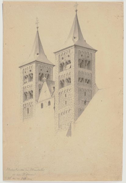Curator: Before us, we have Karl Peter Burnitz’s "Segovia," dating back to 1850, a work rendered in watercolor on paper. Editor: There’s a sense of faded grandeur here, like looking at a memory through mist. The muted palette lends an almost ghostly quality to the architecture. Curator: The artist employs watercolor to capture not just the physical likeness of the Segovia Alcázar, but also to evoke a specific emotional response—one rooted in the Romantic tradition's fascination with history. How does the structure itself speak to you? Editor: The towering structure clearly dominates the composition. It makes me wonder, what did a medieval castle signify in 1850? What continuities of power were Burnitz and his audience grappling with? We should also remember that watercolor has long held associations with femininity, travel, documentation, domesticity, etc. What significance could these have for this scene? Curator: A fruitful question. By 1850, the castle as an idea was imbued with associations of nationalism and chivalry and was considered very masculine; Burnitz would have known this. Here he has painted Segovia with very ‘feminine’ watercolors, and this combination creates interesting dissonance. Perhaps he is highlighting the ways the medieval ideal failed the modern world, and he communicates that through art? Editor: I hadn't considered Burnitz's watercolor medium as playing with the established view on masculinity. Now, do you think there might be social critiques embedded here? Curator: It’s very possible. Burnitz could have certainly been playing with these very gendered elements. Landscape painting often engages with contemporary societal and political concerns. So viewing Burnitz through a more political and social lens definitely could prove productive. Editor: Exactly. These historical landmarks aren't simply beautiful vistas; they carry cultural baggage. To what extent is Burnitz commenting on the burden of this history? Or just ignoring this subject and painting what he likes the way he likes it? Curator: This reading gives us some intriguing directions for our understanding of the artwork. It opens dialogue beyond just its aesthetic qualities, pushing us to think about the ideologies shaping art in 1850s. Editor: And to see beyond the picturesque. To contemplate the past's influence. I appreciate this artwork even more now, recognizing it is both delicate and formidable, like Segovia itself.