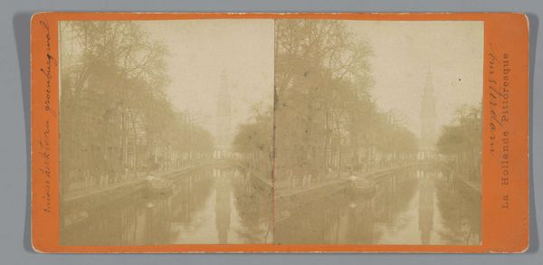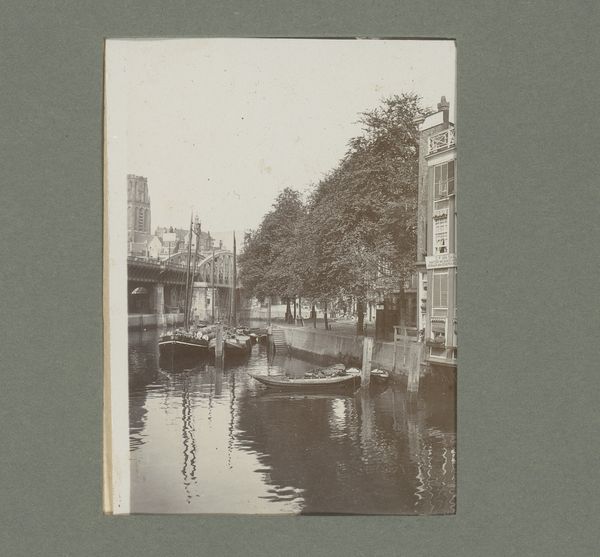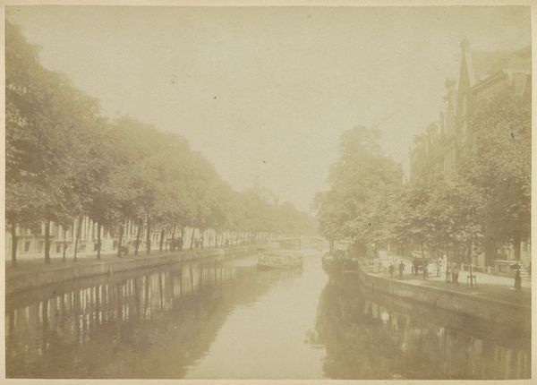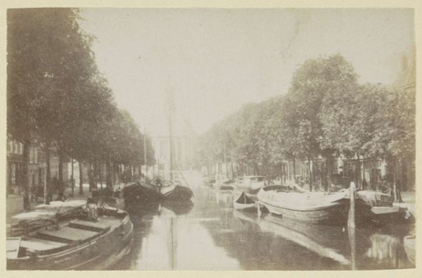 Curator: Here we have "View of the Korte Prinsengracht in Amsterdam, towards the Prinsengracht with Westerkerk" a photograph by George Hendrik Breitner, dating roughly between 1886 and 1910. Editor: It has a muted palette and almost melancholic tone; the grays really convey the city’s dampness. I also can’t help but focus on the foreground, the immediacy of the photographer is quite amazing. Curator: Breitner's work often captured Amsterdam street life and the working class. As photography was evolving, so was its role in society and how it was perceived. Breitner aimed for a more genuine depiction of modern life, a far cry from studio portraiture of the period. Editor: Absolutely, I'm struck by how utilitarian the image seems—the docks, the simple barges lining the canal, the rough texture of the buildings. The entire scene feels incredibly grounded and working-class. Even the haze adds a tangible grit. Curator: The photographic techniques in this era, the collodion process in particular, created its own texture to the image making that atmospheric haze or muted light something natural. There's also that slight blur due to slower shutter speeds that gives a sense of lived experience. Breitner embraces it all instead of fighting it to convey urban realism. Editor: I think the point of view has impact. From the railings, the view feels democratized. It’s as if the work puts the common individual above the representation of social monuments or idealized visions of landscape. The materiality reflects the life of everyday people going to work and moving their materials by the water. Curator: And the presence of the Westerkerk spire is important though subtly incorporated into the frame, isn’t it? Breitner places everyday labor and lived experience alongside institutions, not above or below them, but as coexisting. This photo demonstrates photography's potential as a medium for social observation. Editor: That kind of art becomes important as the cities grow at the pace that happened in the 19th century, right? Capturing a sense of change and documenting reality is what speaks to me. Curator: Indeed, photography helped shape urban identities and perceptions in that era and beyond, contributing significantly to our understanding of the social fabric of a city like Amsterdam. Editor: It has been amazing to really observe this image; noticing its material relevance allows a much richer understanding. Curator: For me, this view into Breitner’s work always brings a greater look into that period of time and photography’s significance at the time.