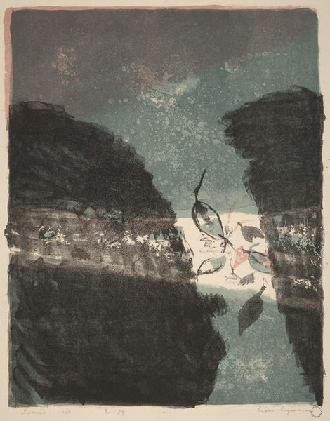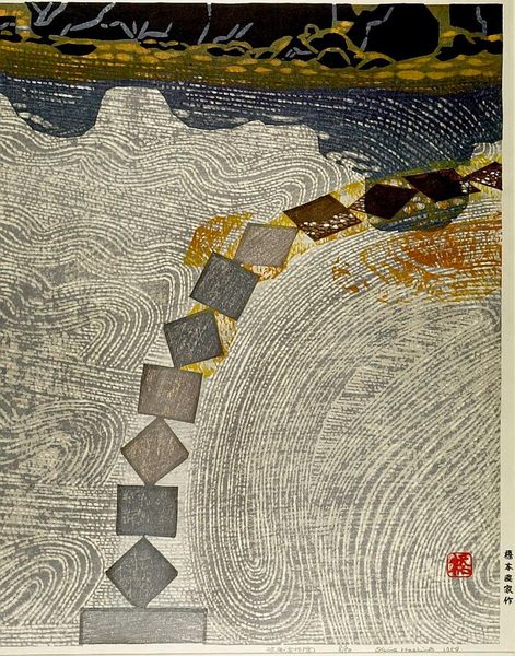 Curator: Here we have Okiie Hashimoto’s woodblock print, Stone Bridge, a work residing here at the Harvard Art Museums. Editor: It's quite evocative! The stark contrast and those ripples...a somber, almost melancholic mood settles in. Curator: Bridges in art often symbolize transitions, connections, even spiritual journeys. Considering Hashimoto’s era, Japan navigated immense social shifts. Editor: The stone bridge itself feels enduring, a constant amidst change. Those perfect concentric circles—echoes, memories. Water often represents the unconscious. Curator: Woodblock prints like this played a crucial role in democratizing art. These weren’t elite commissions; they were accessible, reflecting everyday scenes and popular culture. Editor: The bridge seems to hover, its reflection blurred by the rain. Is it a reminder of permanence, or the ephemeral nature of lived experience? Curator: Perhaps it is both. I think Hashimoto sought to capture a moment of quietude amidst societal flux. Editor: A poignant reflection on time, tradition, and the enduring power of place.