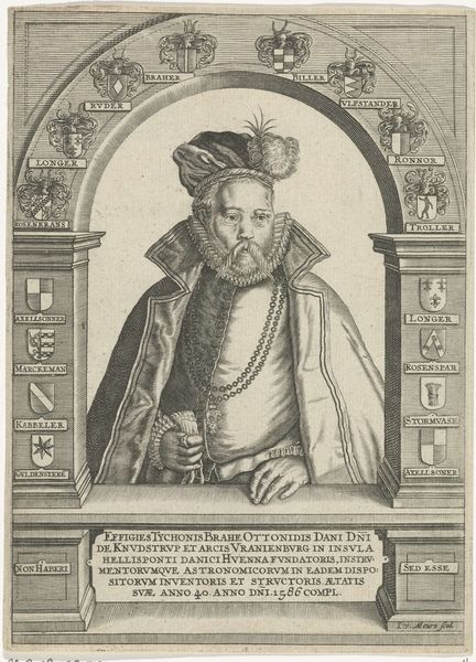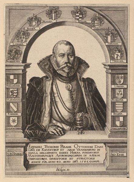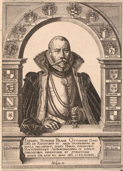 Jacques de Gheyn II created this engraving of Tycho Brahe in 1586. Brahe was a Danish nobleman known for his comprehensive astronomical observations. De Gheyn’s depiction offers insight into the culture of nobility during the Renaissance. Framed by heraldry, Brahe is represented as a man of both science and high social standing. This piece reflects the complex interplay between identity, knowledge, and power in the 16th century. Brahe's meticulous astronomical records challenged existing understandings of the cosmos and, simultaneously, he maintained the privileges afforded to him by his noble birth. The portrait captures Brahe at the height of his career, a period marked by both scientific achievement and the assertion of social status. It serves not just as a record of a man, but as a symbol of the era's intellectual and social landscape, revealing the layered identities within the context of Renaissance Europe.
