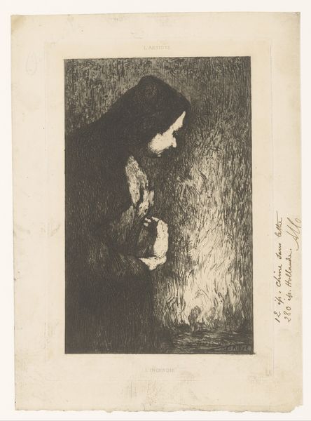 Editor: Here we have Paul Gauguin's "Ia orana Maria (Hail Mary)," created around 1895. It's a drawing using pencil and ink, and it feels so raw and intimate, like a page ripped right from his sketchbook. What strikes you most about this image? Curator: It's fascinating to consider this drawing within the context of Gauguin's broader project of engaging with and, some would say, appropriating Tahitian culture. He was deeply invested in creating an image of Tahiti that often romanticized and exoticized the local people. Note how he overlays Christian iconography onto a Tahitian scene, blending religious and cultural narratives. What do you make of the child on her shoulders and the seemingly religious setting, given that it is a Tahitian subject? Editor: I see the Virgin Mary, but transplanted. The setting doesn't read as European at all. So, is he trying to fuse Tahitian identity with Christian narrative or subjugating one with the other? Curator: Exactly! This tension is crucial. Gauguin sought a 'primitive' authenticity, but that quest was inextricably tied to colonialism's power dynamics. He imposes a European, religious lens while seemingly celebrating Tahitian culture. The public display of such artwork reinforces specific historical and power narratives. How do you think the original audiences might have perceived this? Editor: Perhaps it offered a spiritual bridge, or maybe further Othered Tahitian culture to a European gaze? Knowing what I know about art and colonization, there's an icky, possessive feeling coming from this piece, although, from a purely aesthetic view, I see the artistic allure in his visual choices. Curator: Right. We're now more attuned to these issues, the complicated power dynamics and historical narratives shaping our understanding. So, now we circle back: how should museums handle work like this? Can we separate aesthetic merit from historical issues of appropriation and the shaping of cultures through representation? Editor: These are questions without easy answers! Looking at this, I feel like I’m learning about both art history and the history of how images are used to manipulate entire cultures, both very different lessons learned simultaneously.