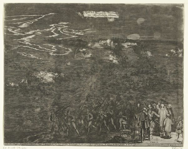 Editor: This is "Nachtelijk tocht van Spaanse soldaten door het water naar Duiveland, 1575" made between 1701 and 1703 by Coenraet Decker. It's an engraving currently held at the Rijksmuseum. The figures wading through the water seem incredibly vulnerable; what can you tell us about this print? Curator: What's striking is the laborious nature depicted. Engraving itself is labor-intensive, mirroring the arduous journey of these soldiers. Think about the copper plate, the tools, the hours spent etching this scene – a process echoing the soldiers' struggle. It really makes you think about what Decker is trying to emphasize here with this level of material detail. Editor: That's a very tactile way of thinking about it! So, are you suggesting that the medium is the message here? The material speaks as much as the subject? Curator: Precisely. Consider the political climate. These prints, circulated widely, shape public perception. By meticulously depicting this grueling journey, Decker participates in the ongoing narrative and shapes opinion concerning military campaigns, which is no small task considering this requires access to very particular materials and skills. What choices in its distribution would amplify its message? Editor: So the physical dissemination is a material act as well? It's like propaganda through production and consumption of art objects. I never really considered that with prints before. Curator: Absolutely. It encourages us to see this print not just as a representation of an event, but also as a manufactured object deeply embedded in its socio-political context. Editor: This has certainly changed how I’ll be looking at prints moving forward, thank you! Curator: Likewise. Paying attention to the object’s materiality adds dimensions of meaning often overlooked.