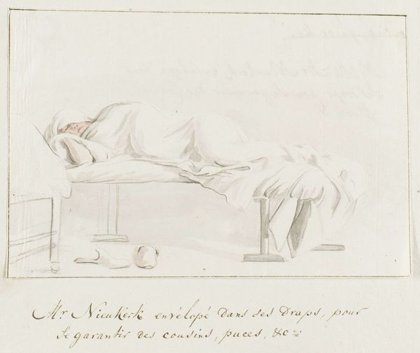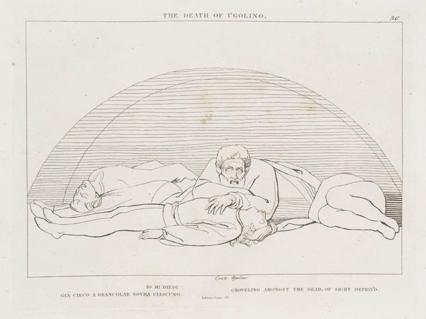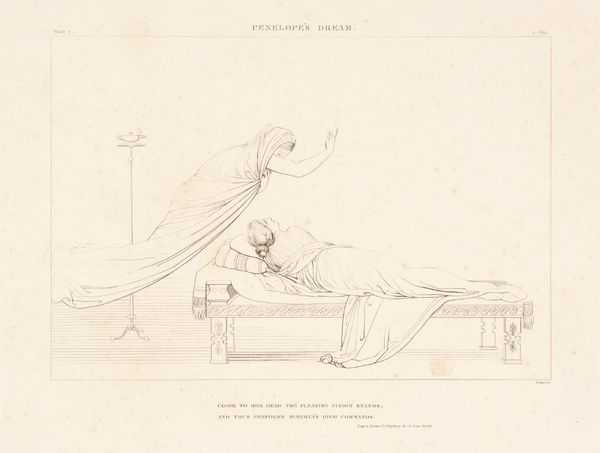 Editor: This is John Flaxman's "The Poets Reposing". It's a delicate line drawing. What strikes me is the almost industrial depiction of repose; the poets are arranged on what looks like a production line. What do you see in this piece? Curator: I see an interesting commentary on the commodification of artistic labor. Flaxman, in his stark rendering, elevates the means of production. Notice how the "lofty beds" are simple, repetitive forms. The poets, like products, are laid out for consumption. Is genius manufactured, or divinely inspired? Editor: So, you're suggesting Flaxman is questioning the romantic idea of the poet? That's fascinating. I hadn’t considered that. Curator: Precisely! And it challenges us to consider the role of the artist in a rapidly industrializing society.