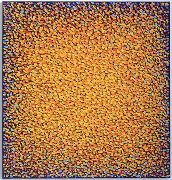 Curator: Welcome. Before us hangs Marcia Hafif's "Broken Color: Cadmium Red, Cadmium Yellow, Ultramarine Blue," painted in 1978. Editor: Wow, it's a mesmerizing field of color! My first thought is of sand dunes seen from above, each grain reflecting slightly different light. There’s an earthy warmth to it that I find instantly comforting. Curator: It's fascinating how Hafif challenges traditional notions of color field painting through systematic application and repetition. It begs us to consider Postminimalism's influences, with her deliberate gesture against pure, unmodulated fields of color and clean lines. Editor: Exactly! It's like she's taking minimalism and roughening it up, adding a human element, an imperfect quality. It feels handmade, like someone painstakingly applied each stroke with intention. Curator: And in that painstaking process, Hafif addresses notions of labor and the demystification of the art object, which resonates with feminist critiques of artistic production. She isn't trying to trick the eye, the labor is laid bare for us to unpack, like the repetitive labor so often ascribed to women. Editor: I love how she doesn’t try to blend the colors perfectly. They exist alongside each other, creating this shimmering, almost optical effect. You can feel each brushstroke! Is it acrylic? Curator: Yes, acrylic on canvas. Which emphasizes that flatness of the canvas while the “broken color” generates subtle optical vibrations and depth. How do you feel the painting situates itself within abstraction? Editor: I feel it's abstraction at its most honest. No grand narratives, just the pure experience of seeing. It's like Hafif is saying, "Here's the paint, here's how I applied it. What do you see?". It really lets the viewer project their own experience onto the work. Which is, I suppose, its own kind of statement. Curator: Precisely. Her choice to restrict the palette draws our focus to process and material—almost acting as a critical inquiry into the foundations of painting. It's both beautiful and incredibly thoughtful. Editor: Totally! Well, I could stare at it for hours. Thanks for giving me a new lens through which to appreciate Hafif’s work. Curator: My pleasure. It's important we keep looking closely. It reminds us that art, like the social fabric, is woven with intention, accident, and enduring relevance.