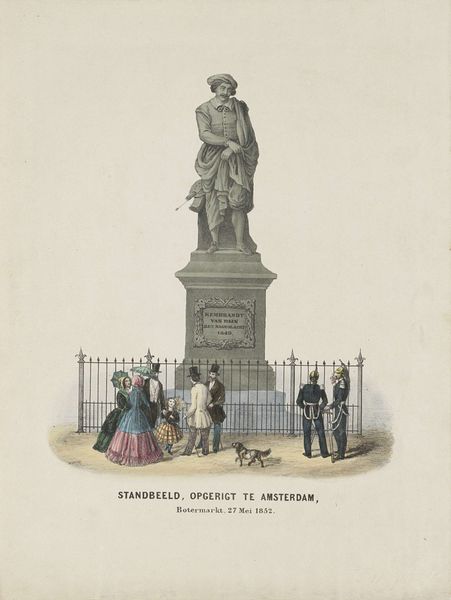 Editor: Here we have an engraving from the period of 1856-1882, entitled "Statue of Laurens Jansz. Coster." It’s a striking print – what’s your take on its historical context? Curator: It's an interesting example of 19th-century historical representation. The choice to depict Coster, who is credited by some with the invention of printing in the Netherlands, speaks to the growing sense of national identity at the time. How does the monument itself contribute to that idea? Editor: Well, the placement of a statue suggests importance, but it also feels like there's a claim being staked, particularly in relationship to claims made for Gutenberg's invention of the printing press. It looks like academic art but I'm wondering why making it a print instead of, well, an actual statue. Curator: Exactly. The circulation of this image through print elevates its impact, transforming it into a potent piece of public imagery, but it allows to make it mobile, to have many copies in different households and other public places. Who is it serving to honor? What political agendas might it fulfill? Editor: It would have the political purpose of cementing Coster as a Dutch hero and reminding people of Dutch achievements. Were monuments like this typically circulated as prints at the time? Curator: Yes, the reproduction and distribution of such images played a role in constructing collective memory and promoting specific historical narratives. What do you notice about the people looking at the monument? Editor: It shows the monument is there for people to visit and see; it’s very public, and meant to inspire national pride. Seeing it like this helps me think about how public art and accessible media work hand-in-hand to shape our understanding of history. Curator: Precisely. Thinking about its reproduction and reception, how do we continue to grapple with its meaning today, beyond the figure depicted?