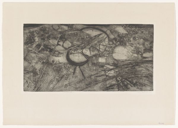 Editor: This dramatic charcoal drawing is titled "Looking West from Zennor Quoit" by John Hubbard. It feels… almost primordial. What symbols do you see in this landscape? Curator: The monolith, the Zennor Quoit, speaks of ancient rituals and connections to the earth. Notice how Hubbard contrasts the solid, grounded stones with the swirling, ethereal sky. Editor: So, the permanence of the stones against the changing sky? Curator: Exactly. The image suggests a dialogue between the temporal and the eternal, a recurring theme in our understanding of landscape. It's a powerful reminder of humanity’s enduring search for meaning within the natural world. Editor: I never thought of landscape as a symbol before. That’s fascinating. Curator: The image resonates with me in new ways now.