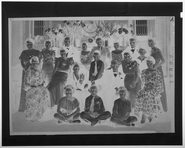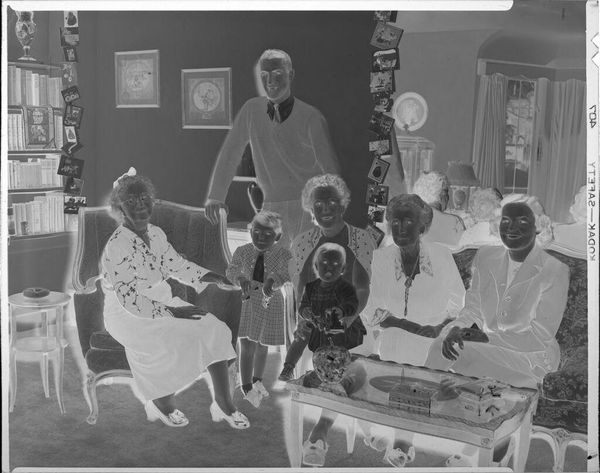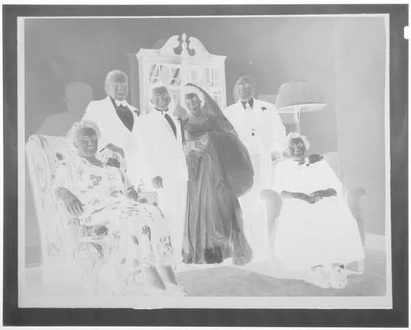 Editor: This is an untitled photograph by John Deusing, featuring a group of kids in costume. It has a slightly eerie feeling to it because of the negative processing. What strikes you about it? Curator: The costumes immediately suggest a constructed identity, a performance of self. Given the lack of specific date, it's hard to pinpoint the cultural context, but the presence of certain costumes prompts questions about representation and cultural appropriation. Editor: Appropriation? Could you explain that further? Curator: Consider the power dynamics at play when children choose certain costumes. Are they celebrating a culture or perpetuating stereotypes? The photograph becomes a document of those choices, and the social implications embedded within them. What do you think about the setting? Editor: I hadn't thought of it that way. The setting looks like a normal living room to me, the normality juxtaposes the oddity of the negative processing. Thank you for your insight.
