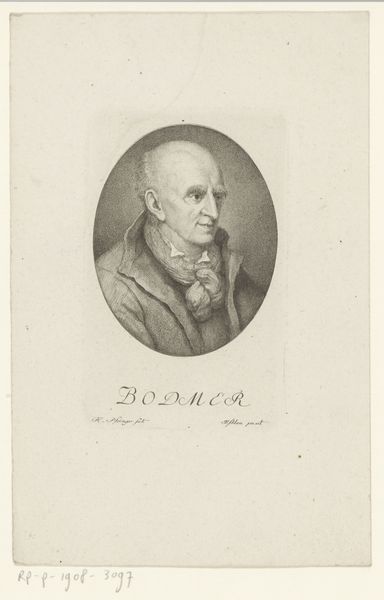 Martin Esslinger created this monochrome print of Johan Jacob Grob, with etching and possibly engraving techniques. Notice how the oval shape, tightly framing the portrait, draws us into the sitter's introspective gaze. The composition is carefully structured: the subject's contemplative pose, with his head resting on his hand, directs our focus to his face. This artistic choice enhances the print's emotional depth, inviting viewers to ponder the subject's thoughts and inner life. Esslinger masterfully uses light and shadow to model Grob’s features, giving form to his face. The subtle variations in tone create a sense of volume and realism, while the fine lines and hatching add texture and detail to the clothing and hair. The portrait unsettles the traditional glorification of the sitter. Instead, it favours an introspective sensibility, making it a fascinating study in human expression. This print exists as an aesthetic object and as a historical and cultural artifact, inviting us to engage with its rich layers of meaning.