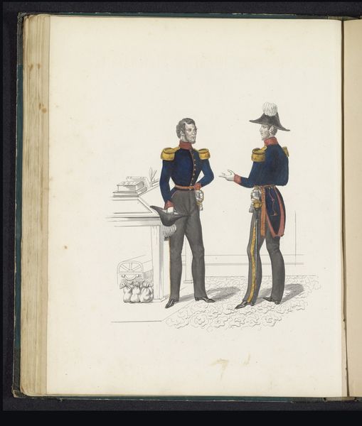 Willem Charles Magnenat created this print in 1845, depicting two uniformed, retired officers. During this period, uniforms were potent symbols, reflecting social status and a strong allegiance to national identity, especially in the Netherlands, which was still consolidating its sovereignty after French rule. The officers’ attire speaks volumes about the gendered and classed nature of military service. Their tailored coats, embellished with epaulettes and trim, underscore the performance of masculinity tied to military authority. However, as retirees, their uniforms perhaps represent a longing for former power, or a sense of duty that transcends active service. The sword could symbolize their readiness to defend national values and interests. Magnenat’s print isn't merely a record of sartorial style but also an intimate glimpse into the self-fashioning of men in 19th-century Dutch society. It’s about how individuals negotiate identity through symbols of status and belonging, inviting us to contemplate the narratives we construct through our clothing choices.