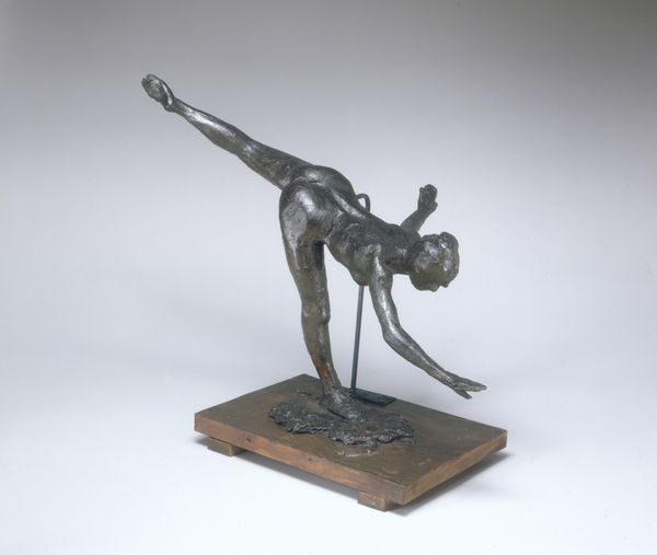 Curator: This is Edgar Degas's "Dancer in the Role of Harlequin," likely conceived between 1879 and 1920. It's a bronze sculpture currently residing at the Metropolitan Museum of Art. Editor: It looks like she is bracing herself before a big leap or even just a huge pratfall. Like right before she’s about to do something incredibly mischievous! There is definitely tension in that pose. Curator: Indeed, there's a certain precocity evident in the tilt of her head and stance. However, placing this work within its social context is crucial. In Degas’ time, ballet was a heavily policed and exploitative industry, especially for young female dancers. It was by no means a field dominated by privileged and wealthy children. Editor: It’s a rough rendering of a dancer for sure! Not romantic in the least. Sort of angular, rough texture, even... Is she actually *nude* as well? What about the harlequin getup? Curator: That’s right. Though we are talking about an artist celebrated for capturing ballerinas en pointe, we should remember that, at its base, Degas’ oeuvre depicts labour. This piece portrays a dancer in a state of near-nudity, likely during a break in the studio, capturing the harsh reality beneath the veneer of the theatre. We should remember that her lack of adornment renders her both physically vulnerable and socially exposed. The reference to Harlequin does however also serve a symbolic function by associating her with both theatrical performance and personal anonymity. Editor: Gosh, that takes away a bit of the playful feel, then. It feels weighted with... otherness. Almost sinister in a way to know she may be trapped and working, not skipping along living an enchanted life. I do also wonder why he never finished the costume and how that affects this dynamic we’re talking about. Curator: Well, it pushes to the foreground ideas of artistic creation, and in turn, this complicated nexus of bodies, identity, and work in 19th-century Paris. The rawness certainly contributes to the sense of labour rather than spectacle, doesn’t it? Editor: Definitely changes everything. So I think from now on I will probably bring both understandings with me when I revisit it—both the possibility of performance, but also awareness and appreciation of what that entails. Curator: A rewarding tension, indeed. I agree it reframes how we think about these very loaded historical artworks.