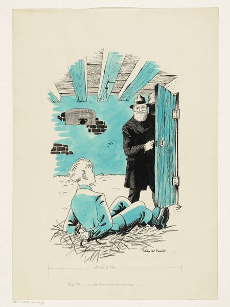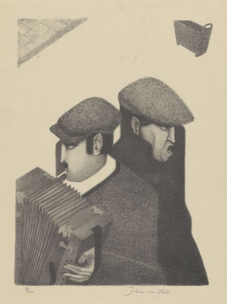 Curator: Welcome to the Rijksmuseum. Today, we will be discussing Johan van Hell’s pencil drawing, “Zingende zaag," made sometime between 1899 and 1938. It depicts two men, one playing the musical saw, and the other holding an accordion. My first impression is how muted and almost melancholic it feels. Editor: Yes, and that’s interesting considering that a “zingende zaag” translates to “singing saw". Perhaps that title is deeply ironic, knowing that it emerged in a period framed by significant socio-political turmoil and mass social movements. The drawing evokes a certain solemnity, maybe reflecting the somber mood of the interwar period. Note their hats and what could be interpreted as worker's uniforms—could it be a reference to a disaffected or marginalized social group during a volatile time? Curator: Looking at the figures themselves, one immediately notices their somewhat exaggerated features, especially in their faces. The artist’s meticulous application of the pencil strokes defines volume and creates subtle gradations, adding to the overall intensity of their expressions. The sharp angles of the saw held in the foreground almost bisect the frame, which disrupts any reading that might offer comfortable compositional closure. Editor: The fact that this drawing borders on caricature points to the social satire and critique often used to give a voice to the voiceless and challenge existing power dynamics. The accordion, juxtaposed with the singing saw, can be viewed as commentary on art's accessibility: one mass produced, one deeply singular. Their positioning in the frame makes the standing man appear as a ghostly, looming figure—another disruption to our interpretation. I would like to know how the subjects would perceive this work. Curator: From a formal perspective, van Hell uses hatching and cross-hatching to model his figures, concentrating shadow under the brims of their caps, deepening the set of their eyes, further complicating the mood. This is particularly apparent in the treatment of the hands holding the saw, each drawn with detailed attention to the articulations. The stark contrast is emphasized by the flatness of the negative space surrounding the men, as if they are on a stage, sharply spotlighted and set apart. Editor: Van Hell seems to push the viewer to engage critically. He draws our attention not only to the musical performance but also the social realities surrounding it—especially considering the role music can play in facilitating social organizing and dissent. This interplay turns "Zingende zaag" into an eloquent representation of humanity amid disruption. Curator: Indeed, on closer inspection, there are structural paradoxes embedded in the form that reflect ambiguities that exceed any initial impression. Editor: Agreed. This certainly urges me to reflect on the diverse roles that art can play in addressing historical narrative.