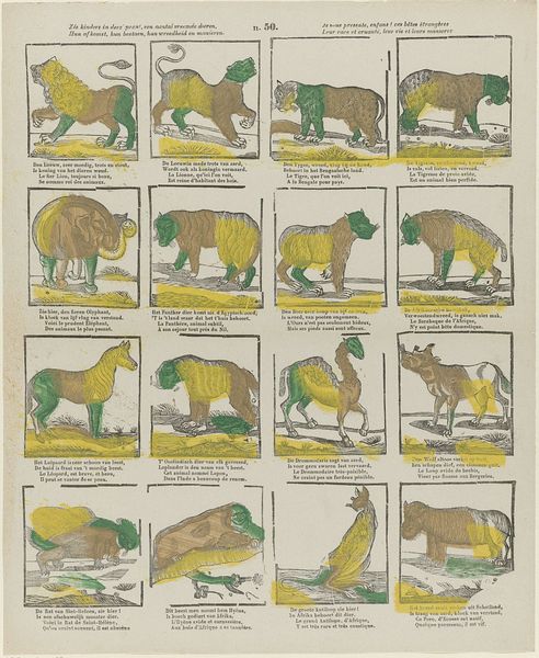 Curator: Here we have "Verschillende dieren / Différents animaux," a print by Franciscus Antonius Beersmans, likely created between 1866 and 1902. It's a lithograph featuring several animals in a grid. Editor: It strikes me as charmingly naive, almost dreamlike. The animals are familiar yet slightly off-kilter in their presentation and color. Curator: Precisely. Note the stark, clear lines and the flat application of color. Beersmans is less concerned with representing these creatures realistically and more focused on a graphic, almost diagrammatic approach. We might consider how the use of line dictates form. Editor: Absolutely. The categorization—the gridded presentation—reminds me of early attempts to codify the natural world, reflecting colonial desires to catalogue and control. What's the significance, though, of the limited, somewhat arbitrary use of color? Curator: The colors appear to emphasize certain planes of the animals, disrupting the natural forms in interesting ways. We see how a green "saddle" has been added on to one of the animals as if it's simply the pattern to add onto it like the pattern of a suit. This invites reflection upon their inherent construction as signs, as concepts. Editor: That deconstruction by partial coloring is a powerful point, given this work emerged during an intense period of species identification amid expanding European colonial reach. It calls into question not just representation, but the ethics of taxonomies imposed upon a diverse global ecosystem. Curator: And there is also something that is subtly being addressed about the arbitrary quality of categorization itself: where do we place our distinctions? Editor: The work highlights the problematic history of objectifying nature—both as resources to be exploited and as subjects to be scientifically "understood" within biased frameworks. These images feel almost like an instruction manual to dominate. Curator: I see the subversion of naturalistic forms by this particular kind of linear ordering creating this diagrammatic effect. Editor: Ultimately, it provides fodder for interrogating power. Curator: Indeed. It seems both artistically straightforward, but theoretically complex. Editor: It reminds me to be mindful of the political implications embedded in seemingly innocent images of the natural world.