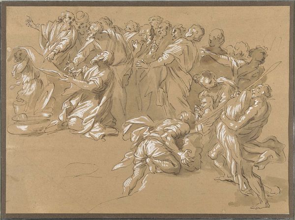 Curator: Welcome. We're looking at "Lazarus' opv\u00e6kkelse," a drawing rendered in ink and pen. It dates back to 1593 and is attributed to Giovanni Battista della Rovere. Editor: Immediately, I'm struck by the dramatic dynamism of the scene. It feels so raw, immediate; the pen lines seem to vibrate with the energy of the resurrection itself. Curator: Absolutely. The Mannerist style is quite evident here. Della Rovere employs exaggerated poses and crowded figures to heighten the emotional intensity, really placing this miraculous biblical narrative within a tangible history. How does the socio-political context of that period amplify the drawing’s inherent tension for you? Editor: It is an image of power, right? And faith is a tool. Think of how this narrative was leveraged – this promise of rebirth – and think about the distribution and politics around death during this period; how those anxieties of powerlessness would have been activated through witnessing the miracle that the work depicts. Also notice, for example, how central this act of, let's say, "white" resurrection is situated historically, systematically within art. Curator: A crucial point. The theatrical staging lends itself to an interpretation about public spectacle and the politics of religious imagery in 16th century Europe. One sees the history painting traditions very clearly, here, within religious confines, and how the performative, public display served larger political purposes. Editor: Looking closely at Lazarus, emerging from what looks like a rough, earthly enclosure, you can’t ignore the performativity of this emergence, which you named. Is he a willing participant or merely a figure in this larger symbolic drama? Considering issues of agency becomes quite significant in these religiously framed pieces of art. It forces one to interrogate who gets a voice, who's centered, and at whose expense? Curator: It certainly challenges us to think critically about these depictions of power, both spiritual and temporal, and to be aware of the multiple layers of meaning embedded within religious art from that period. Della Rovere's Lazarus presents, after all, an incredible historical moment to study. Editor: And in seeing these moments critically we understand the contemporary echoes too. It prompts so much further thinking about agency, display, and narrative.