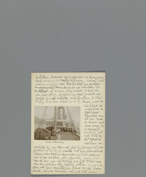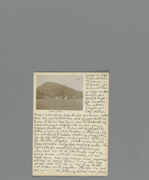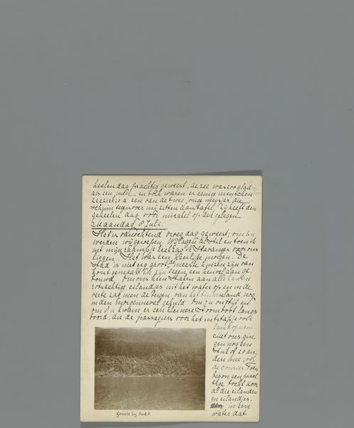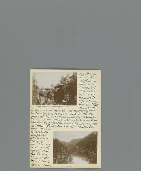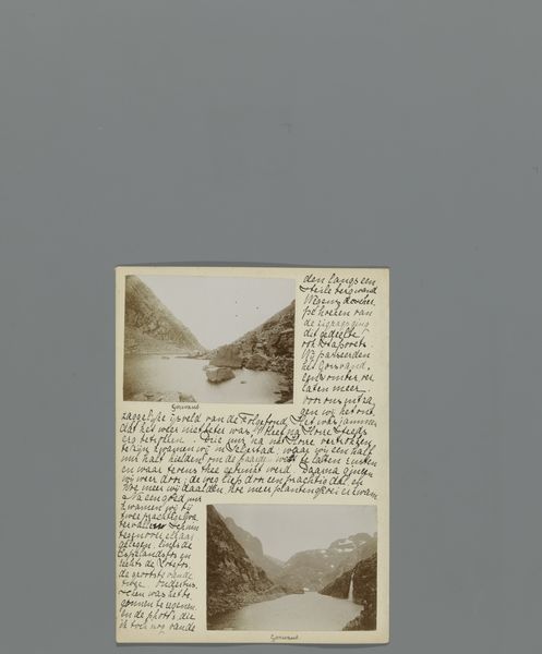 Curator: Here we have a fascinating object—a page, “Zeventiende pagina van een dagboek van een reis door Noorwegen met twee foto's van de Flesefossen en Brattlandsdalen,” likely from between 1895 and 1899, by Hendrik Herman van den Berg. It combines writing with albumen prints, documenting a journey through Norway. Editor: It feels incredibly intimate. There's something poignant about these small-scale landscape photographs mounted alongside handwritten notes. It speaks of observation and immediacy—like capturing a fleeting moment. I'm drawn to the materiality; the aged paper, the faded sepia tones… you can almost feel the journey itself. Curator: The albumen print was particularly popular during this period for its fine detail and tonal range. Think about what it means to select this photographic method. Norway's landscape gained significant prominence at the intersection of scientific interest and artistic exploration at this time. This could serve to underline a romantic sense of discovery, which echoes the journal format too. Editor: It suggests that these landscapes were not just observed, but collected. And perhaps it even speaks of tourism, albeit in its infancy; it is evidence of capturing the beauty and perhaps exploiting and commodifying it at once. Do you think that combining photography and writing offers greater depth, or rather limits each form’s individual expression? Curator: By juxtaposing the handwritten text with photographic images, it creates an integrated visual narrative, more emotive perhaps, or, in any case, offering diverse ways of viewing than text and photo would achieve in separation. There’s the personal element, the journal entry providing an additional lens. It transforms these landscapes into deeply personal memories. Editor: Absolutely. And to bring our perspective full circle: these methods also bring the landscapes firmly into our own world, by which I mean through material culture they achieve their continuity through time and memory. Hendrik Herman van den Berg, the writer and photographer, becomes, through their selection, now simply an organizer or binder. Curator: This piece acts as a multi-layered document: not just of place, but of a subjective experience encountering it. It holds cultural significance, and captures the human desire to document, record, and ultimately, interpret the world around us. Editor: And it encourages reflection on how we, today, continue to make, trade, and memorialize places in similar yet distinct ways. It's a captivating piece—thank you for shedding light on it!