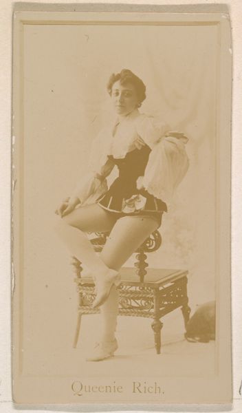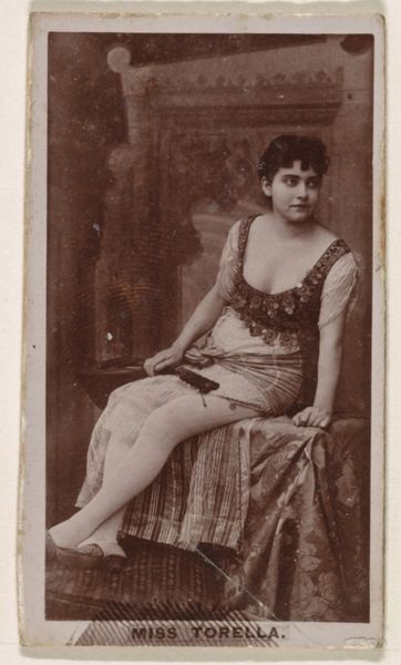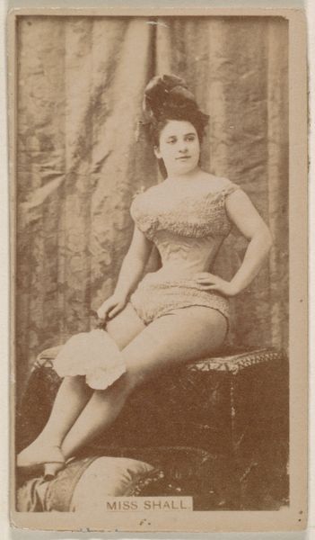 Curator: Look at this carte-de-visite featuring Mlle. Elisa Saracco, a photo taken around 1890 by the Kinney Brothers to advertise their Sweet Caporal Cigarettes. What's your first impression? Editor: Sepia-toned and suggestive! It evokes a Belle Époque world of risqué glamour... an almost defiant sensuality with an aura of coy invitation, the vintage equivalent of pin-up art. Curator: Absolutely. It's interesting how the accoutrements – the fur draped just so, the ornate chair – aim to elevate what is essentially an advertisement into something of high art or at least a collector's piece. The erotic symbolism feels overt by our standards, although certainly less blatant at the time it was conceived, don't you think? Editor: The symbolism is wonderful! The soft fabrics are juxtaposed against the implied hardness of the chair—symbols of both exposure and a very guarded opulence, an intriguing dynamic with layers of subtle seduction. It’s an early archetype we see endlessly copied in the industry from this period on. Curator: This image acts as a portal—opening up complex perspectives and inviting us to think about the evolution of beauty standards, marketing practices, and ideas about gender and sensuality in our cultural narrative. Editor: Right! We can almost track cultural attitudes towards sexuality just by following changes in its visual language. And to think, this was all to sell cigarettes! A real relic of its time. It’s strangely fascinating, this dance between commerce and iconography. Curator: Definitely, that interplay is something worth musing about; now, when you look back at the work, how would you describe its resonance to our listeners? Editor: I think, above all, it serves as a vivid prompt to contemplate our perceptions: about who makes it into popular imagery and how fleeting symbols echo longer memories across ages.