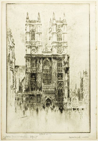 Curator: This etching from 1905 by Joseph Pennell is entitled "The Guild Hall," a London landmark depicted in his characteristic style. What's your initial read of the piece? Editor: It feels...ephemeral, almost dissolving before your eyes. The detail is there, especially in the architecture, but it's veiled, softened, dreamlike. Curator: The etching process itself lends to that atmospheric quality. Consider how printmaking at the turn of the century offered new means to visualize social subjects at a time when London's class system was undergoing great reform. Editor: Exactly! This soft focus also subtly speaks to the building's function and representation as an institution in city life. Are we truly seeing it clearly, or are the etched lines already obscuring our access? Curator: Interesting! Pennell's perspective is key, isn't it? The low vantage point, the figures in the foreground...They’re part of this civic stage. His aesthetic choices, rooted in Whistler's influence and the Etching Revival movement, speak to the social dynamics present. Editor: I see a hint of American exceptionalism, too. Pennell, an American expatriate, captures the energy and ambition, as he would again after his return to the United States and in his lithographs about WWI factory work. This isn't merely documentation, but also subtle advocacy of a "working city". Curator: His depictions often idealize productivity, obscuring any grittier realities. "The Guild Hall" hints at London's complexities and contradictions. But the light almost romanticizes power rather than addressing potential systemic inequalities present at the time, wouldn't you say? Editor: Perhaps, yet its accessibility, produced to be widely distributed and consumed, becomes democratic. A paradox is thus struck that reveals the socio-economic structure that has historically influenced artistic creations. Food for thought on Pennell's complex position in this social context. Curator: Indeed, analyzing the work beyond the mere visual narrative pushes the viewers to consider it in terms of accessibility, distribution, and engagement with political reform, which in turn emphasizes a dialogical interpretation, linking his artworks to socio-political developments in early 20th century. Editor: Looking at this piece in a new light prompts crucial insights into society at that time. Curator: And its ability to communicate these dialogues with a contemporary viewer.