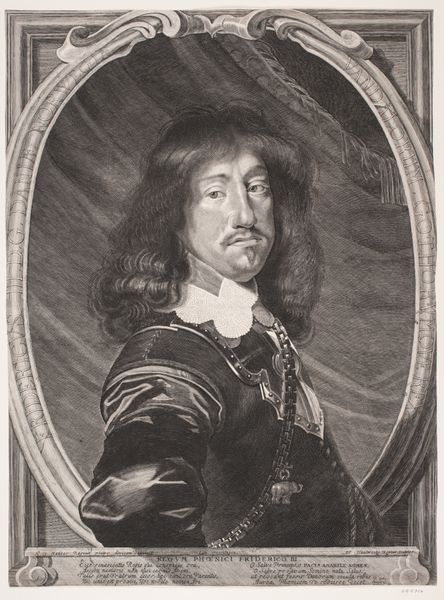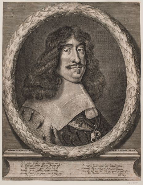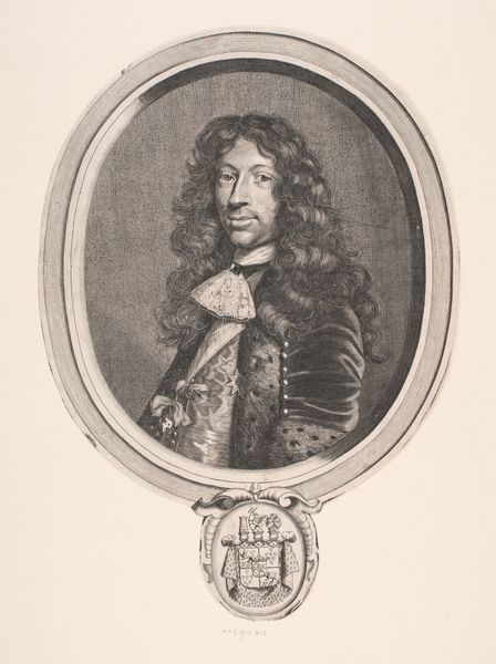 Curator: Take a look at this finely rendered engraving, titled “Portret van Charles de la Porte,” created sometime between 1675 and 1727 by Claude Duflos. What's your first impression? Editor: The detail is incredible! I'm immediately drawn to the intricacy of the lace collar and the decorative jacket. It's a stark image, perhaps suggesting something of the man's character? Stoic, perhaps? Curator: The process of engraving allows for such meticulous detail. Consider the labor involved in producing the original plate. Each line is carved manually. What this suggests to me is a high demand for accurate portrayals, maybe for distribution or for marking someone's importance in society? Editor: Absolutely, and it's critical to situate a piece like this within its socio-historical framework. Who was Charles de la Porte, Duc de la Meilleraye? Power and status dictated who got their portraits made. Let’s consider the ways in which gender and class intersect in visual representations such as these. Curator: I am thinking more about how the circulation of such engravings might affect the social landscape: Do they serve a purpose? Are these intended to solidify power structures? This reproduction creates accessibility to something formerly possessed only by those in the ruling class, but the materials indicate it is still reserved for people who have access to higher levels of consumption and education. Editor: That intersection between power and portrayal is precisely what makes portraits like these so compelling. The way Duflos uses line here isn’t merely decorative; it communicates the Duke's societal position. It creates a discourse between identity, presentation, and authority. What would the impact of these images be to a community? Curator: By dissecting Duflos's technique and acknowledging the labor involved, we begin to see not only artistry but also the societal framework influencing artistic production. This forces us to examine art's interaction with economics, politics, and consumerism, pushing us to think beyond purely aesthetic values. Editor: Indeed. It reminds us that even what seems like a straightforward portrait is deeply embedded in layers of social and political context. Examining those connections gives the work greater meaning. Curator: A striking piece when considering the means through which it was made, as well as its purpose as propaganda for an upper class elite. Editor: I agree. Duflos's rendering not only captures an individual's likeness, but serves as a marker for an era and its hierarchical structures, too.